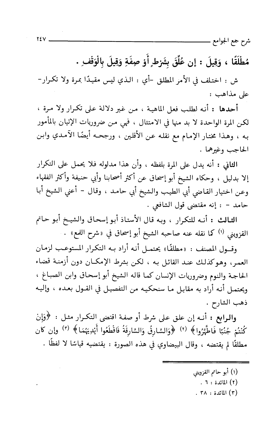 والرابع: أنه إن علق على شرط أو صفة اقتضى التكرار مثل: {وإن كنتم جنباً فاطهروا} {والسارق والسارقة فاقطعوا أيديهما} وإن كان مطلقاً لم يقتضيه، وقال البيضاوي في هذه الصورة: يقتضه قياساً لا لفظاً.