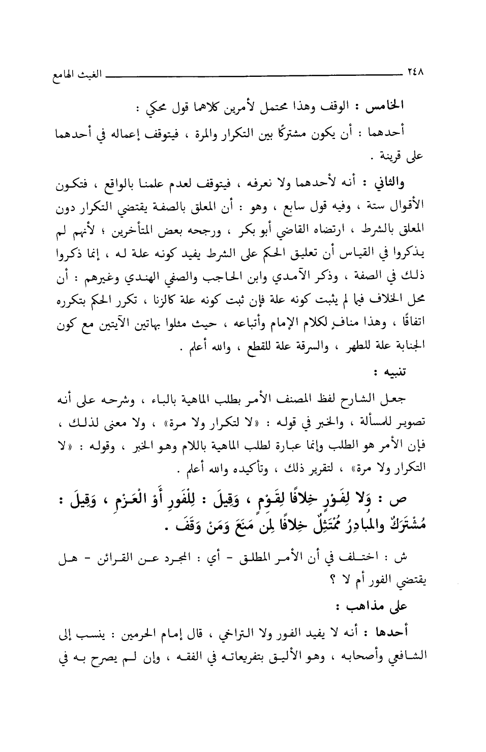 ش: اختلف في أن الأمر المطلق أي المجرد عن القرائن هل يقتضي الفور أم لا؟