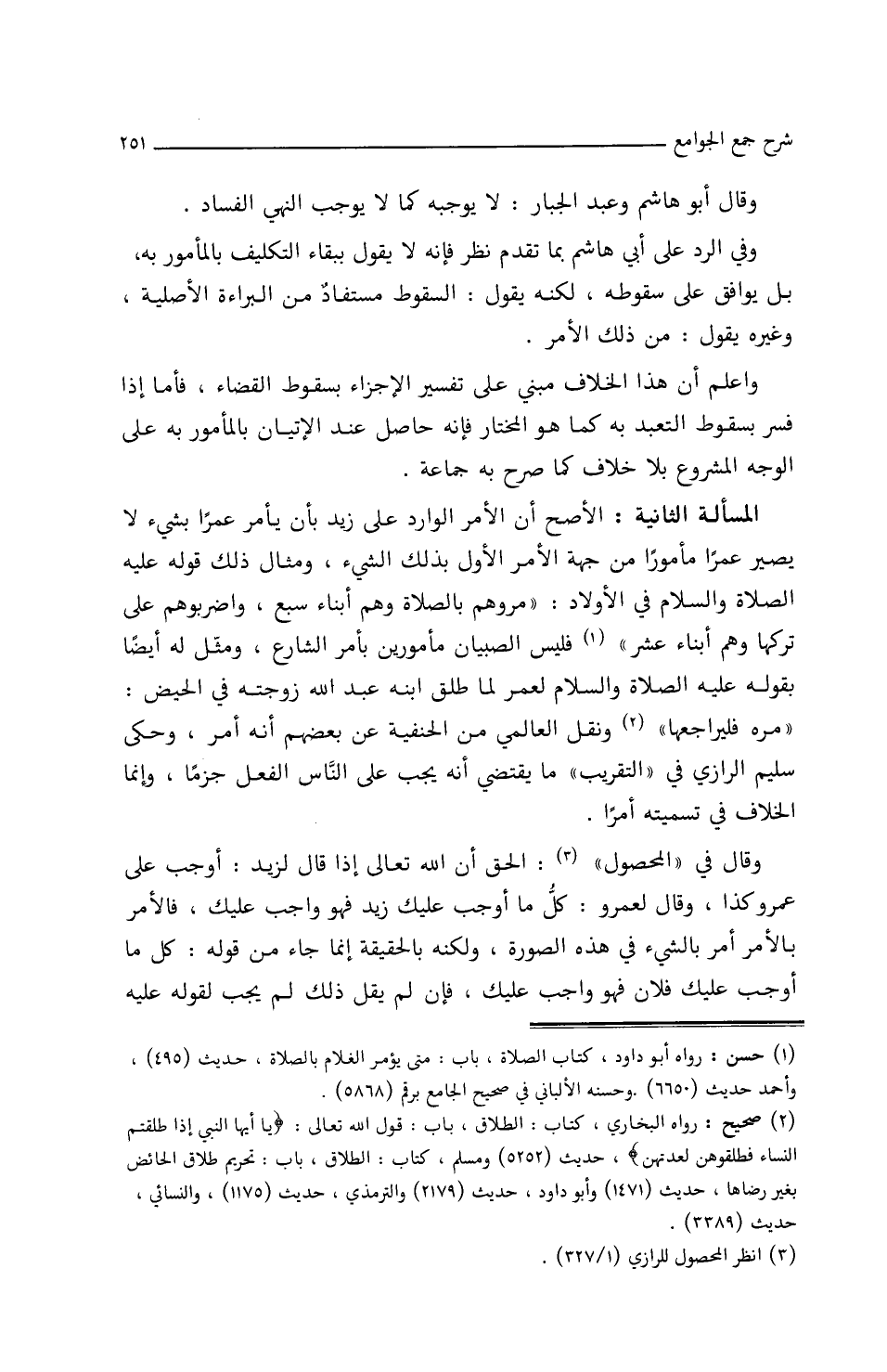 المسألة الثانية: الأصح أن الأمر الوارد على زيد بأن يأمر عمرا بشيء لا يصير عمراً مأموراً من جهة الأمر الأول بذلك الشيء، ومثال ذلك قوله عليه الصلاة والسلام في الأولاد: ((مروهم بالصلاة وهم أبناء سبع واضربوهم على تركها وهم أبناء عشر)) فليس الصبيان مأمورين بأمر الشارع، ومثل له أيضاً بقوله عليه الصلاة والسلام / (٦٨/ أ/ م) لعمر لما طلق ابنه عبد الله زوجته في الحيض: ((مره فليراجعها)) ونقل العالمي من الحنفية عن بعضهم أنه أمر، وحكى سليم الرازي في (التقريب) ما يقتضى أنه يجب على الناس الفعل جزماً، وإنما الخلاف في تسميته أمراً.