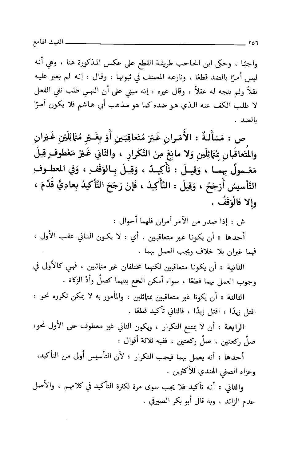 ص: مسألة: الأمران غير متعاقبين أو بغير متماثلين غيران والمتعاقبان بمتماثلين ولا مانع من التكرار، والثاني غير معطوف قيل معمول/ (٥٦/ ب / د) بهما، وقيل: تأكيد، وقيل بالوقف، وفي المعطوف التأسيس أرجح وقيل: التأكيد، فإن رجح التأكيد بعادي قدم، وإلا فالوقف.