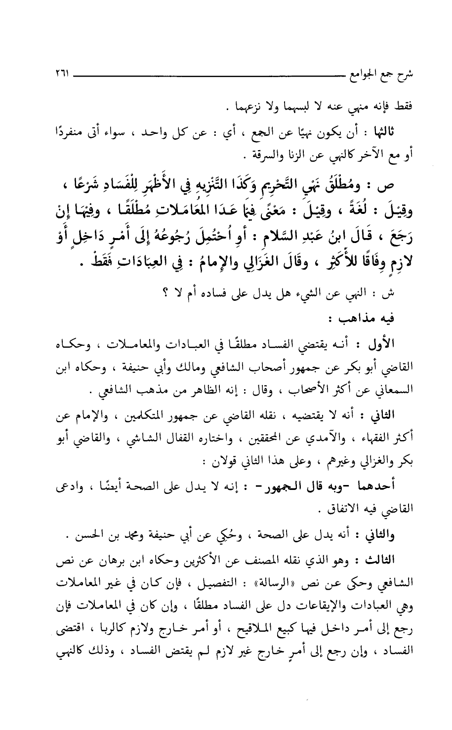 الأول: أنه يقتضي الفساد مطلقاً في العبادات والمعاملات، وحكاه القاضي أبو بكر عن جمهور أصحاب الشافعي ومالك وأبي حنيفة، وحكاه ابن السمعاني عن أكثر الأصحاب، وقال: إنه الظاهر من مذهب الشافعي.
