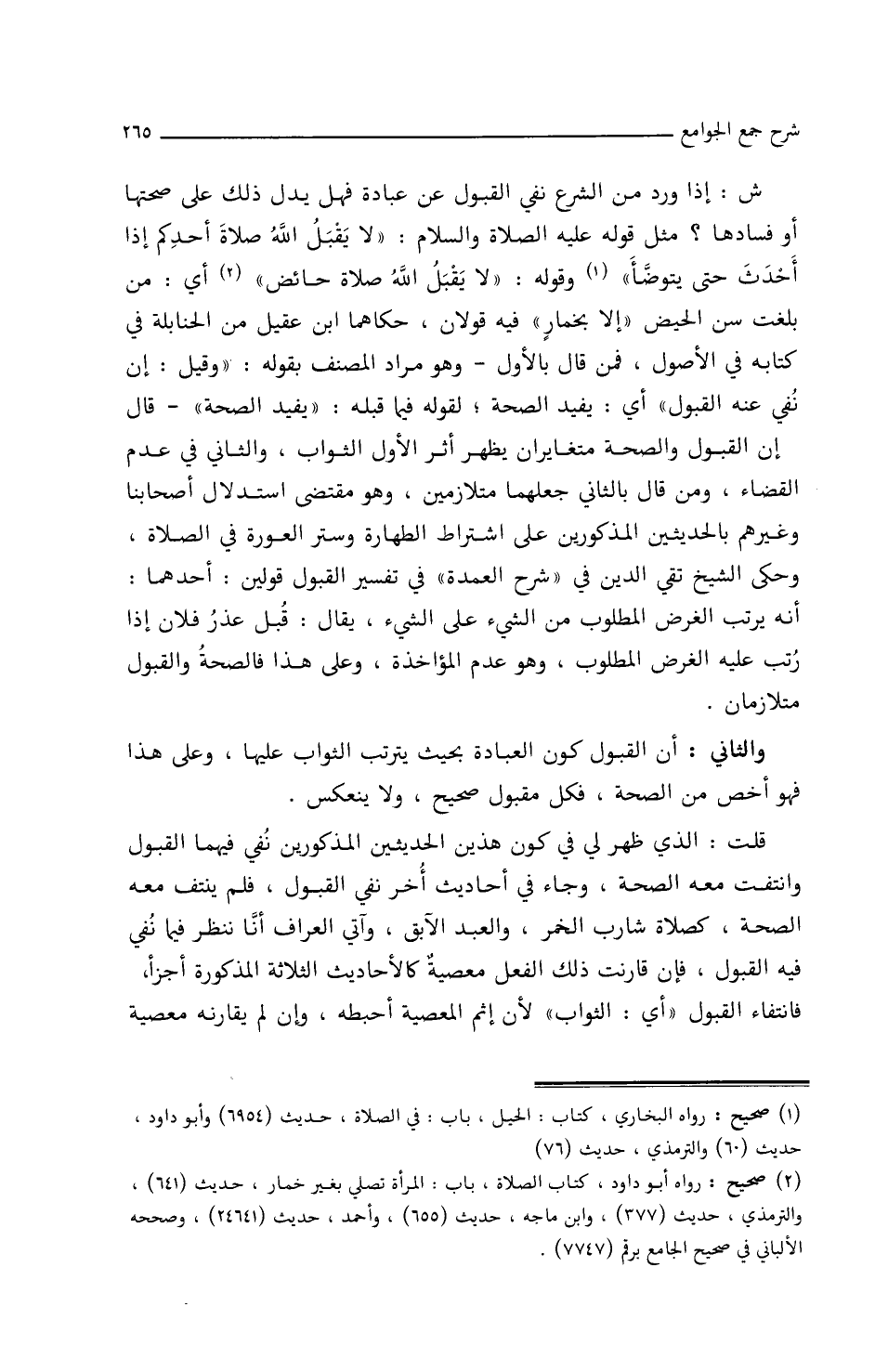 قلت: الذي ظهر لي في كون هذين الحديثين المذكورين نفى فيهما القبول وانتفت معه الصحة، وجاء في أحاديث أخر نفي القبول، فلم ينتف معه الصحة، كصلاة شارب الخمر، والعبد الآبق، وآتي العراف أنا ننظر فيما نفي فيه القبول، فإن قارنت ذلك الفعل معصية كالأحاديث الثلاثة المذكورة أجزأ، فانتفاء القبول (أي الثواب) لأن إثم المعصية أحبطه، وإن لم يقارنه معصية