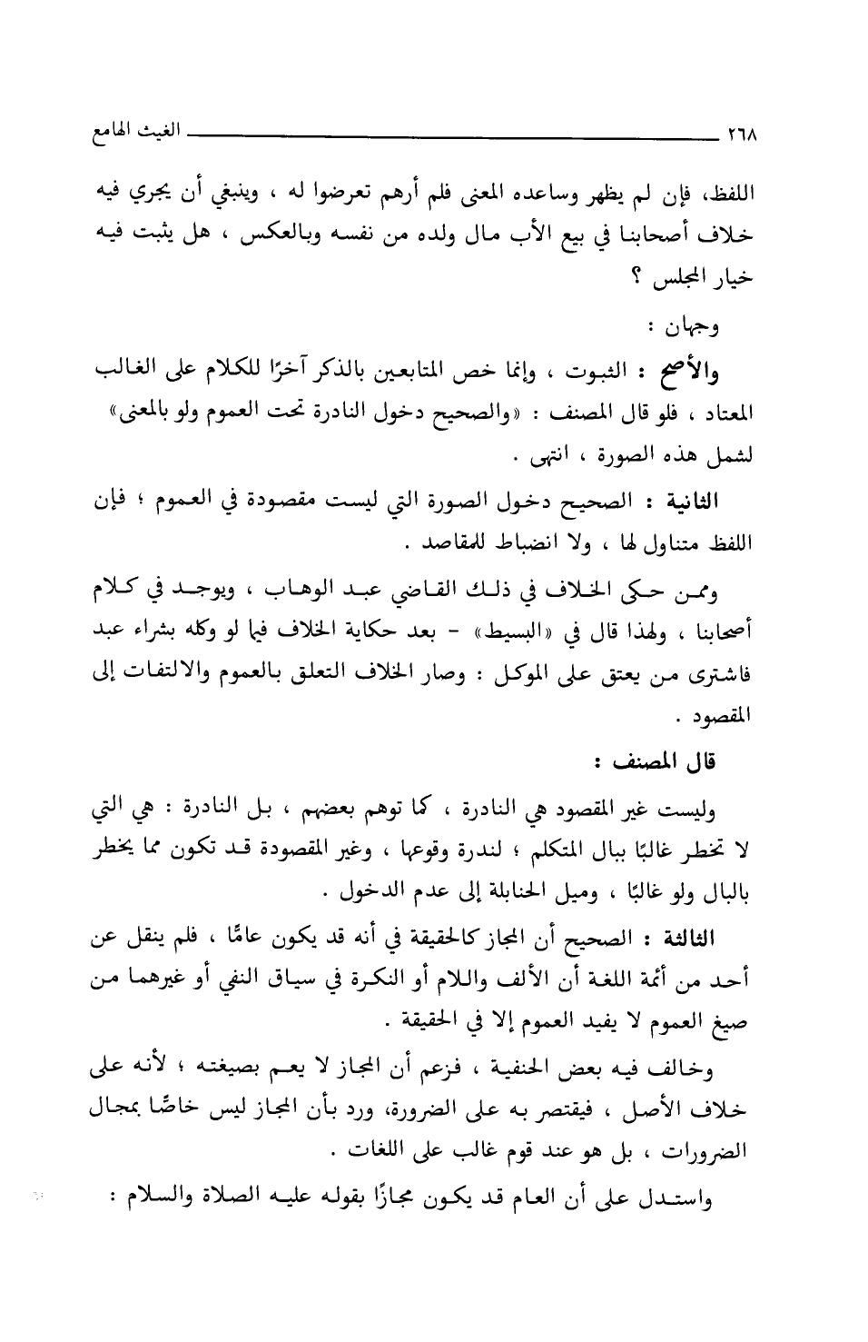 والأصح: الثبوت، وإنما خص المتبايعين بالذكر آخراً للكلام على الغالب المعتاد، فلو قال المصنف: (والصحيح دخول النادرة تحت العموم ولو بالمعنى) لشمل، هذه الصورة، انتهى.