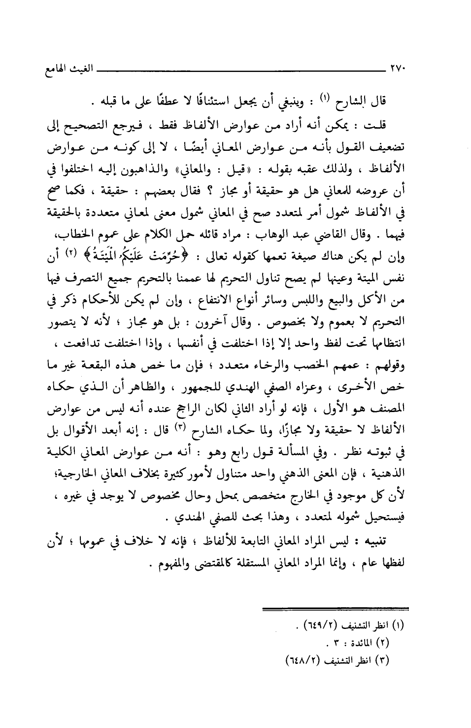 وقال آخرون: بل هو مجاز، لأنه لا يتصور انتظامها تحت لفظ واحد إلا إذا اختلفت في أنفسها، وإذا اختلفت تدافعت، وقولهم: عمهم الخصب والرخاء متعدد، فإن ما خص هذه البقعة غير ما خص الأخرى، وعزاه الصفي الهندي للجمهور، والظاهر أن الذي حكاه المصنف هو الأول، فإنه لو أراد الثاني لكان الراجح عنده أنه ليس من عوارض الألفاظ لا حقيقة ولا مجازاً، ولما حكاه الشارح قال: إنه أبعد الأقوال بل في ثبوته نظر.