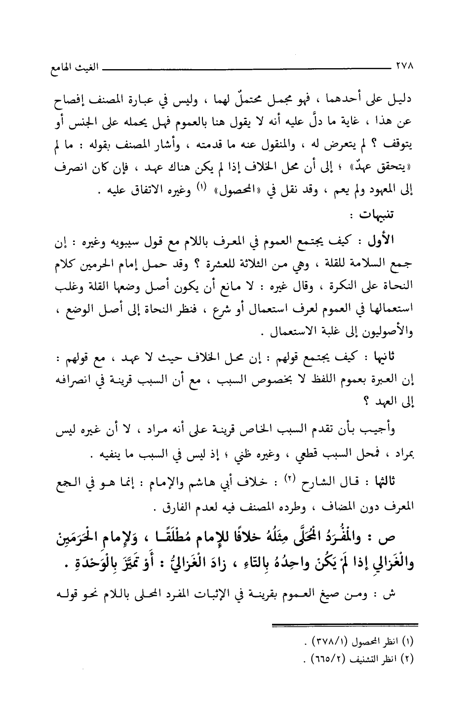 ص: والمفرد المحلى مثله خلافا للإمام مطلقا، ولإمام الحرمين والغزالي إذا لم يكن واحده بالتاء، زاد الغزالي: أو تميز بالوحدة.