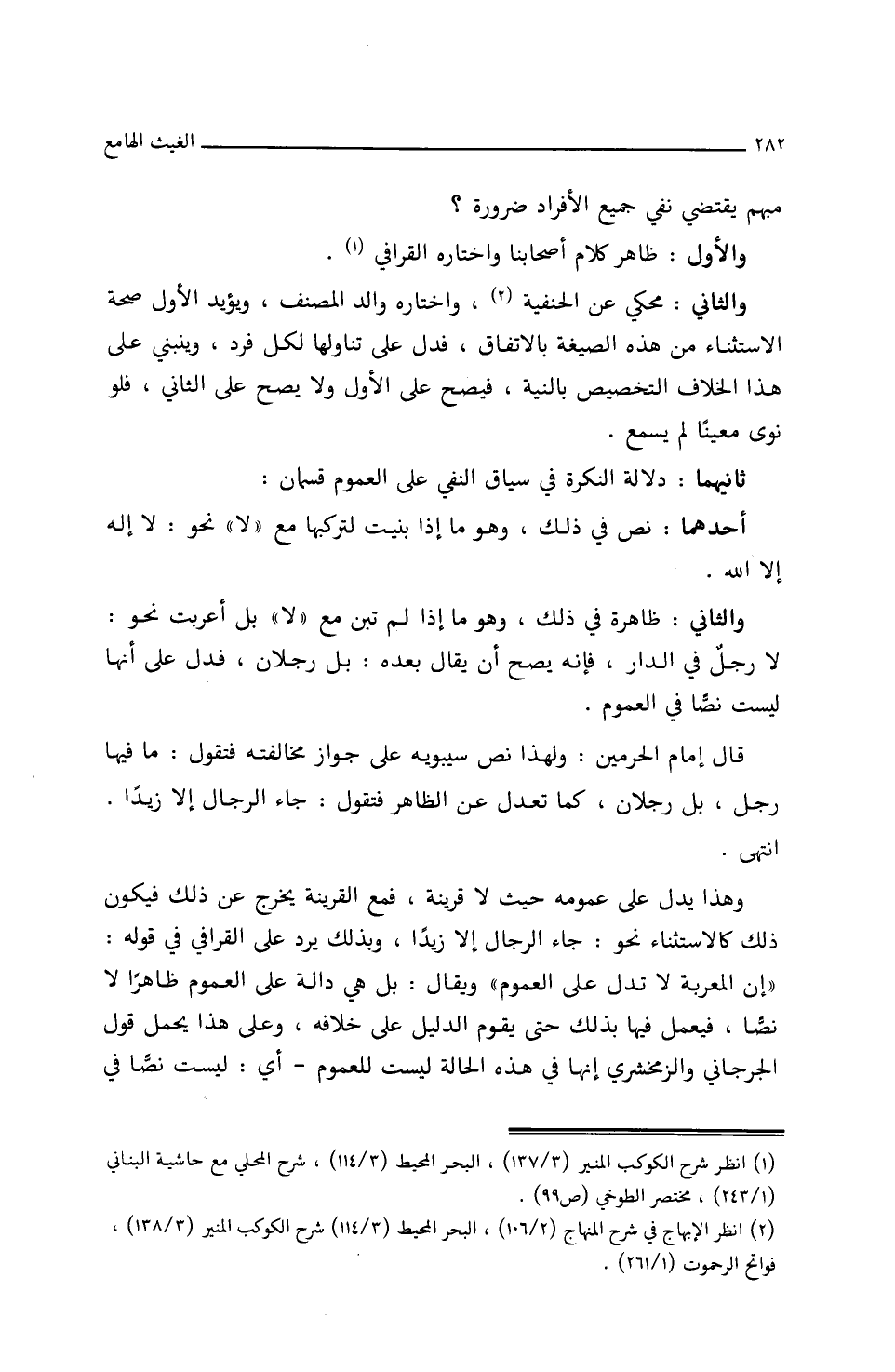 والثاني: ظاهرة في ذلك، وهو ما إذا لم تبن مع (لا) بل أعربت نحو: لا رجل في الدار، فإنه يصح أن يقال بعده: بل رجلان، فدل على أنها ليست نصا في العموم.