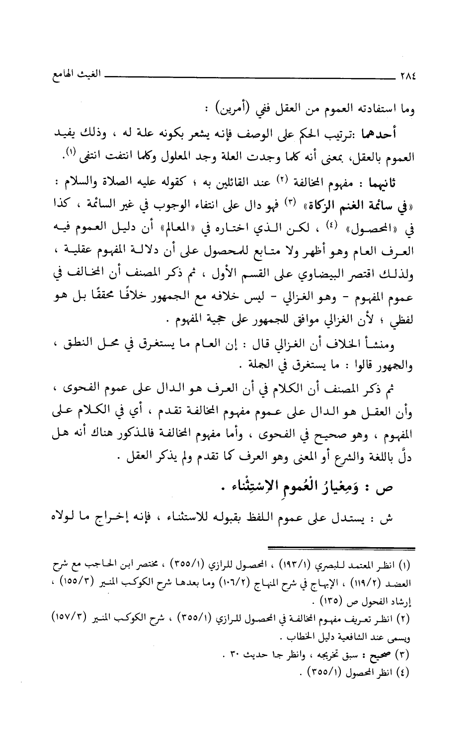 ثانيهما: مفهوم المخالفة عند القائلين به، كقوله عليه الصلاة والسلام: ((في سائمة الغنم الزكاة)) فهو دال على انتفاء الوجوب في غير السائمة، كذا في (المحصول) لكن/ (٧٩/أ/م) الذي اختاره في (المعالم) أن دليل العموم فيه العرف العام وهو أظهر ولا متابع للمحصول على أن دلالة المفهوم عقلية، ولذلك اقتصر البيضاوي على القسم الأول ثم ذكر المصنف أن المخالف في عموم المفهوم – وهو الغزالي – ليس خلافه مع الجمهور خلافا محققا بل هو لفظي، لأن الغزالي موافق للجمهور على حجية المفهوم.