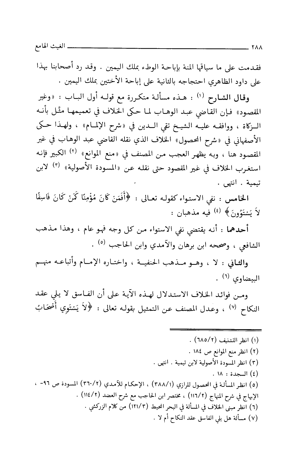 الخامس: نفي الاستواء كقوله تعالى: {أفمن كان مؤمنا كمن كان فاسقا لا يستوون} فيه مذهبان: