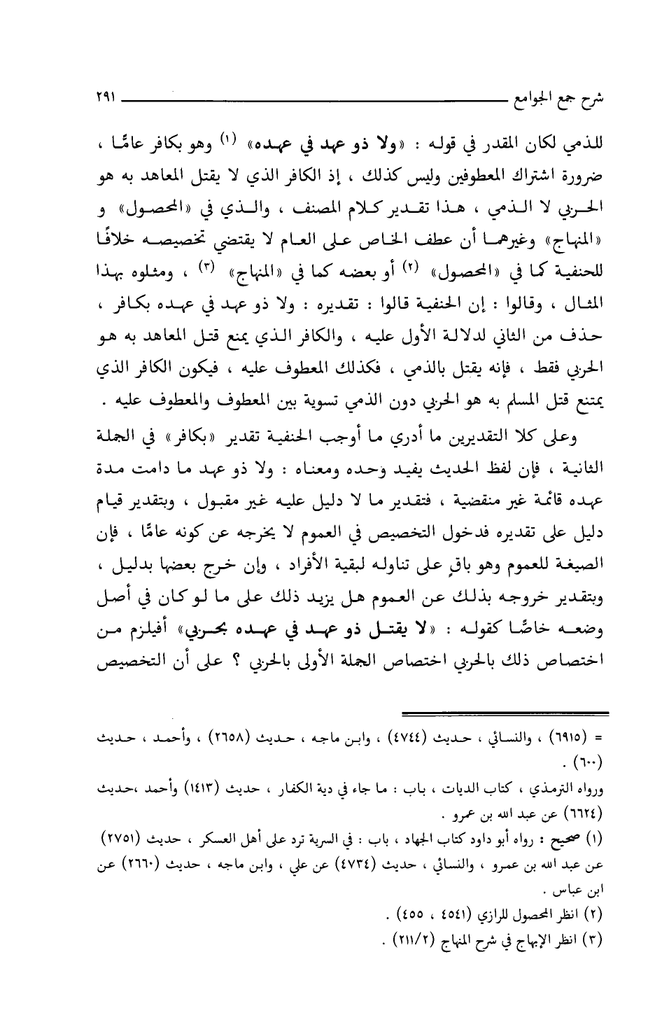 وعلى كلا التقديرين ما أدري ما أوجب الحنفية تقدير (بكافر) في الجملة الثانية، فإن لفظ الحديث يفيد وحده ومعناه ولا ذو عهد، ما دامت مدة عهده قائمة غير منقضية فتقدير ما لا دليل عليه غير مقبول، وبتقدير قيام دليل على تقديره فدخول التخصيص في العموم لا يخرجه عن كونه عاما، فإن الصيغة للعموم وهو باق على تناوله لبقية الأفراد، وإن خرج بعضها بدليل، وبتقدير/ (٨١/ب/م) خروجه بذلك عن العموم هل يزيد ذلك على ما لو كان في أصل وضعه خاصا كقوله: (لا يقتل ذو عهد في عهده بحربي) أفيلزم من اختصاص ذلك بالحربي اختصاص الجملة الأولى بالحربي؟ على أن التخصيص