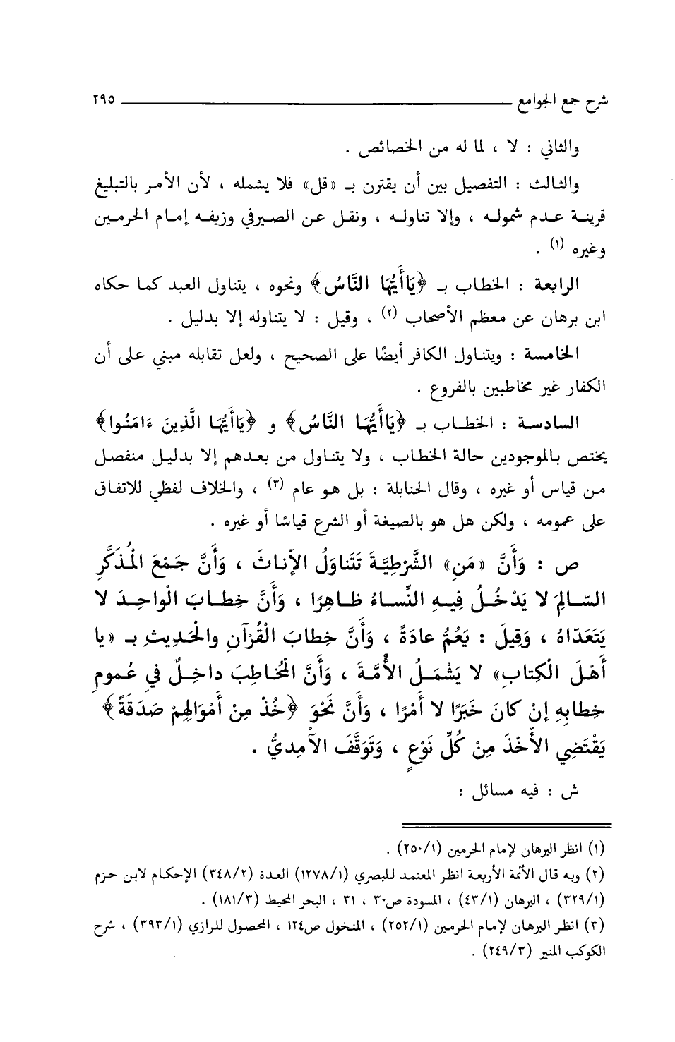 ص: وأن (من) الشرطية تتناول الإناث، وأن جمع المذكر السالم، لا يدخل فيه النساء ظاهرا، وأن خطاب الواحد لا يتعداه، وقيل: يعم عادة، وأن خطاب القرآن والحديث بـ (يا أهل الكتاب) لا يشمل الأمة، وأن المخاطب داخل في عموم خطابه إن كان خبرا لا أمرا، وأن نحو: {خذ من أموالهم صدقة} يقتضي الأخذ من كل نوع وتوقف الآمدي.