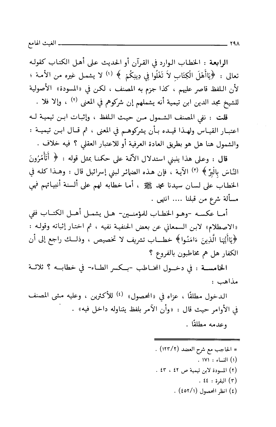 الرابعة: الخطاب الوارد في القرآن أو الحديث على أهل الكتاب كقوله تعالى: {يا أهل الكتاب لا تغلوا في دينكم} لا يشمل غيره من الأمة، لأن اللفظ قاصر عليهم، كذا جزم به المصنف لكن في (المسودة) الأصولية للشيخ مجد الدين ابن تيمية أنه يشملهم إن شركوهم في المعنى وإلا فلا.