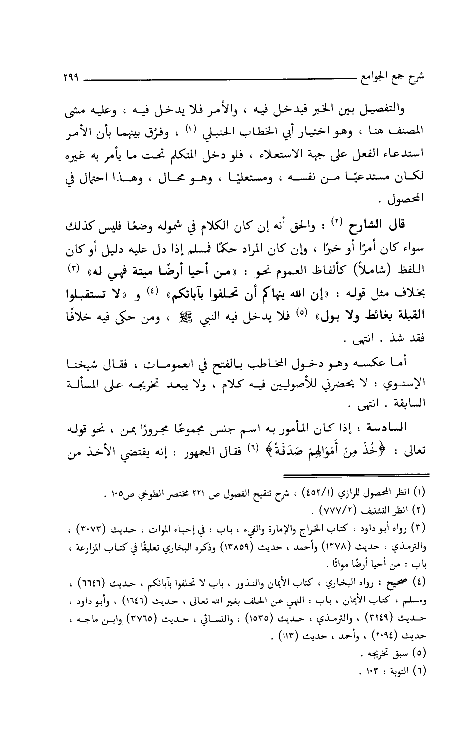 قال الشارح: والحق إنه إن كان الكلام في شموله وضعا فليس كذلك سواء كان أمرا أو خبرا، وإن كان المراد حكما فمسلم إذا دل عليه دليل أو كان اللفظ (شاملا) كألفاظ العموم نحو: ((من أحيا أرضا ميتة فهي له)) بخلاف مثل قوله: ((إن الله ينهاكم أن تحلفوا بآبائكم)) و ((لا تستقبلوا القبلة بغائط ولا بول)) فلا يدخل فيه النبي صلى الله عليه وسلم ومن حكى فيه خلافا فقد شذ. انتهى.