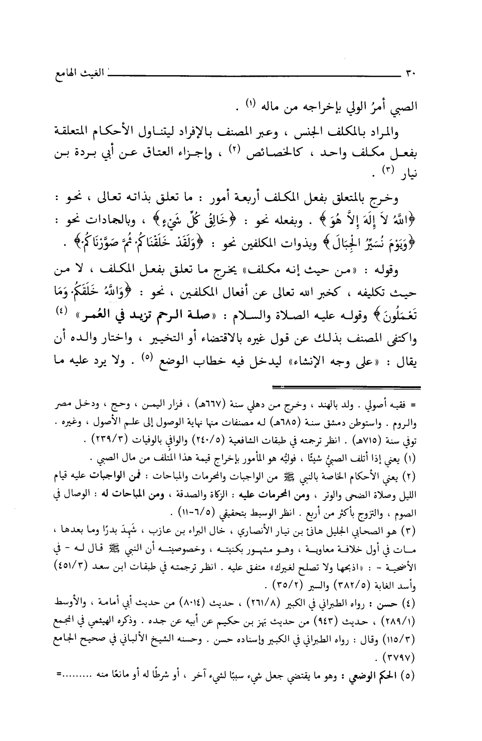 وخرج بالمتعلق بفعل المكلف أربعة أمور: ما تعلق بذاته تعالى، نحو: {الله لا إله إلا هو} وبفعله نحو: {خالق كل شيء}، وبالجمادات نحو: {ويوم نسير الجبال} وبذوات المكلفين نحو: {ولقد خلقناكم ثم صورناكم}.