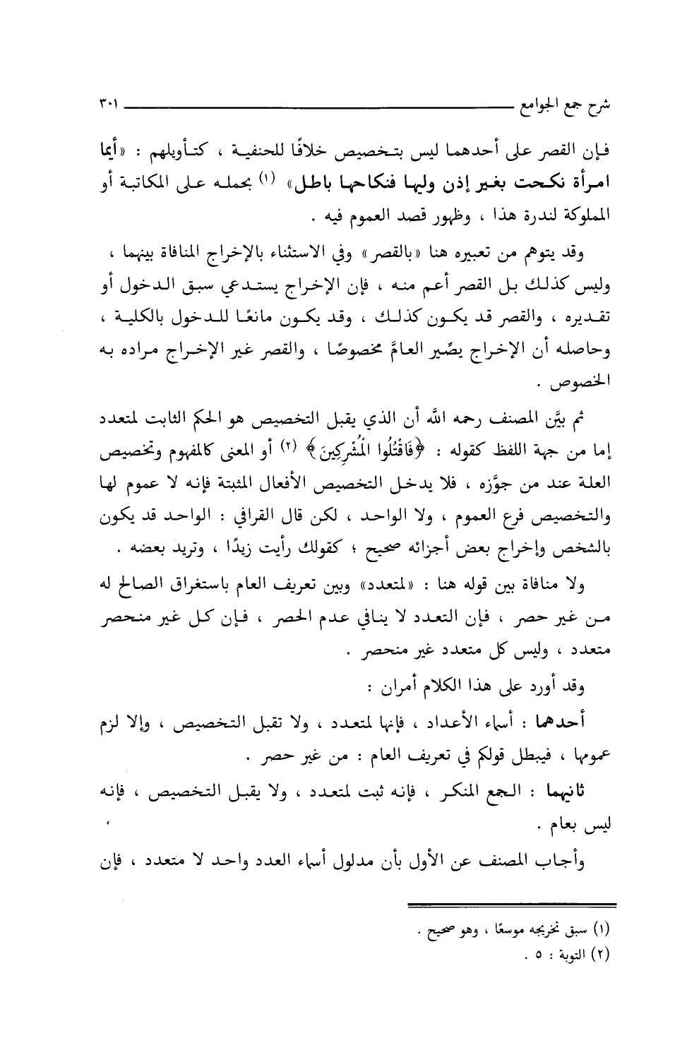 فإن القصر على أحدهما ليس بتخصيص خلافا للحنفية، كتأويلهم، ((أيما امرأة نكحت بغير إذن وليها فنكاحها باطل)) بحمله على المكاتبة أو المملوكة لندرة هذا، وظهور قصد العموم فيه.