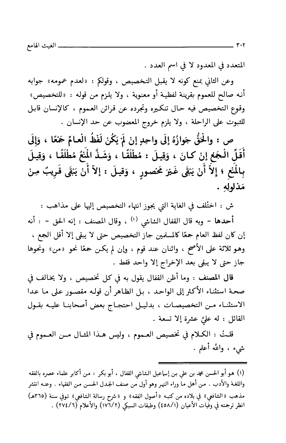 قال المصنف: وما أظن القفال يقول به في كل تخصيص، ولا يخالف في صحة استثناء الأكثر إلى الواحد, بل الظاهر أن قوله مقصوراً على ما عداً الاستثناء من التخصيصات بدليل احتجاج بعض أصحابنا عليه بقول القائل: له علي عشرة إلا تسعة/ (٦٨ب/د).