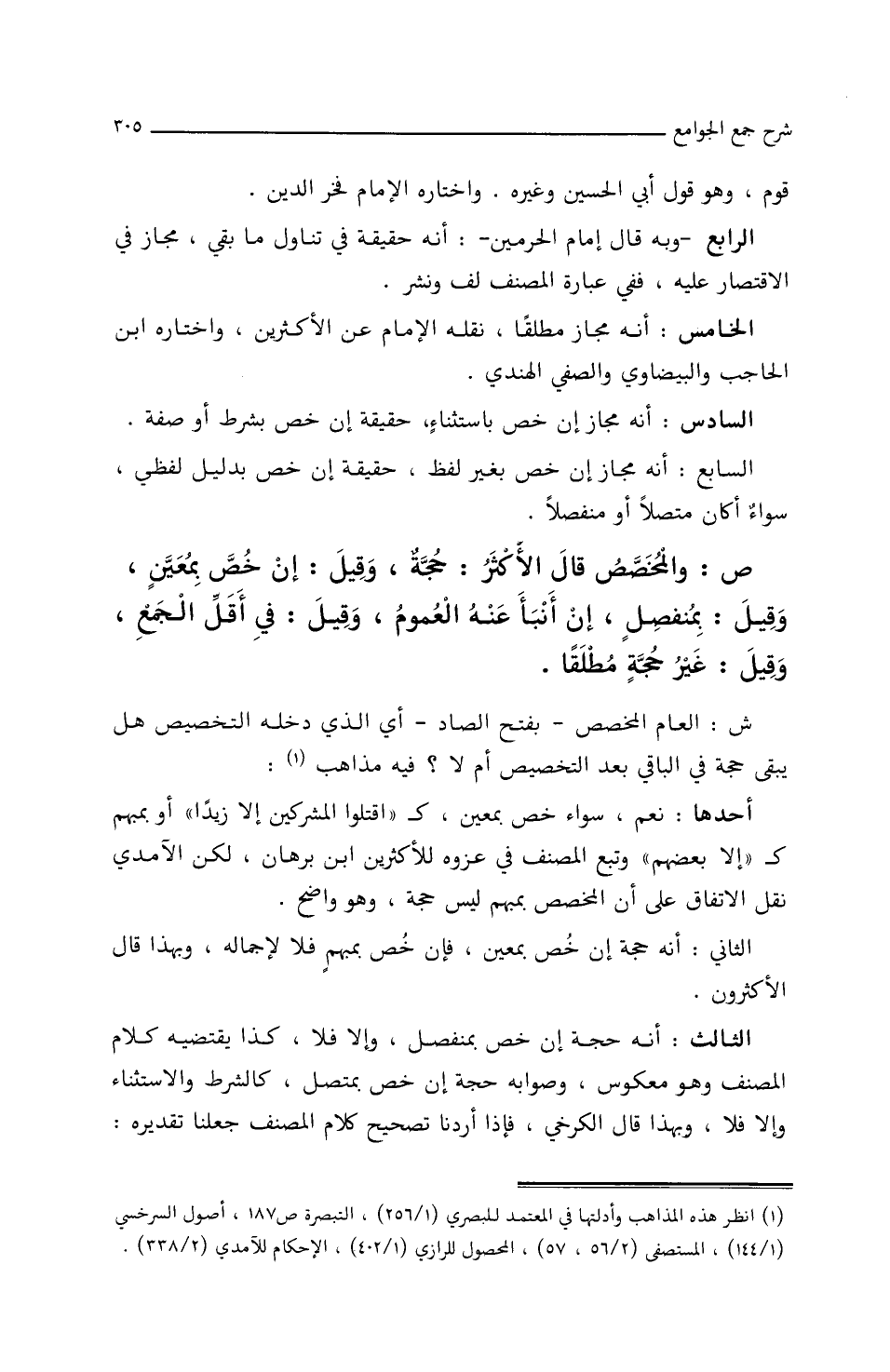 ش: العام المخصص – بفتح الصاد – أي الذي دخله التخصيص هل يبقى حجة في الباقي بعد التخصيص أم لا؟ فيه مذاهب: