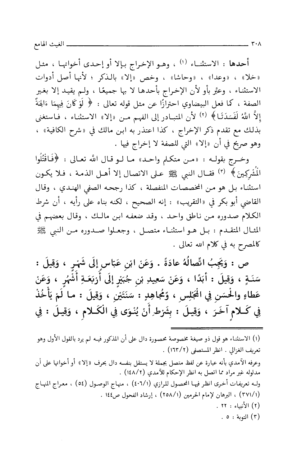 أحدها: الاستثناء وهو الإخراج بإلا أو إحدى أخواتها، مثل (خلا) و (عدا) و (حاشا) وخص (إلا) بالذكر لأنها أصل أدوات الاستثناء وعبر بأو لأن / (٧٠أ/د) الإخراج بأحدها لا بها جميعا، ولم يقيد إلا بغير الصفة كما فعل البيضاوي احترازا عن مثل قوله تعالى: {لو كان فيهما آلهة إلا الله لفسدتا} لأن المتبادر إلى الفهم من (إلا) الاستثناء فاستغني بذلك مع تقدم ذكر الإخراج كذا اعتذر به ابن مالك في (شرح الكافية) وهو صريح في أن (إلا) التي للصفة لا إخراج فيها.