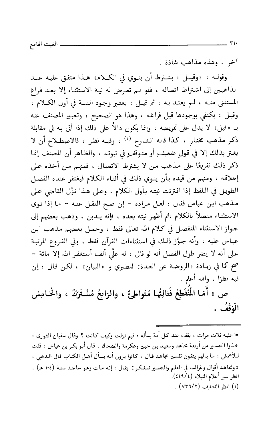 وقوله: (وقيل: يشترط أن ينوي في الكلام) هذا متفق عليه عند الذاهبين إلى اشتراط اتصاله، فلو لم تعرض له نية الاستثناء إلا بعد فراغ المستثنى منه، لم يعتد به، ثم قيل: يعتبر وجود النية في أول الكلام وقيل: يكتفى بوجودها قبل فراغه، وهذا هو الصحيح وتعبير المصنف عنه بـ (قيل) لا يدل على تمريضه وإنما يكون دالا على ذلك/ (٨٧/أ/م) إذا أتى به في مقابلة ذكر مذهب مختار كذا قاله/ (٧٠ب/د) الشارح، وفيه نظر، فالاصطلاح أن لا يغتر بذلك إلا في قول ضعيف أو متوقف في ثبوته، والظاهر أن المصنف إنما ذكر ذلك تفريعا على مذهب من لا يشترط الاتصال، فمنهم من أخذه على إطلاقه ومنهم من قيده بأن ينوي ذلك في أثناء الكلام فيغتفر عنده الفصل الطويل في اللفظ إذا اقترنت نيته بأول الكلام وعلى هذا نزل القاضي مذهب ابن عباس فقال: لعل مراده – إن صح النقل عنه – ما إذا نوى الاستثناء متصلا بالكلام ثم أظهر نيته بعده، فإنه يدين وذهب بعضهم إلى جواز الاستثناء المنفصل في كلام الله تعالى فقط، وحمل بعضهم مذهب ابن عباس عليه، وأنه جوز ذلك في استثناءات القرآن فقط، وفي الفروع المرتبة على أنه لا يضر طول الفصل أنه لو قال: له علي ألف أستغفر الله إلا مائة – صح كما في زيادة (الروضة عن العدة) للطبري و (البيان) لكن قال: إن فيه نظراً، والله أعلم.