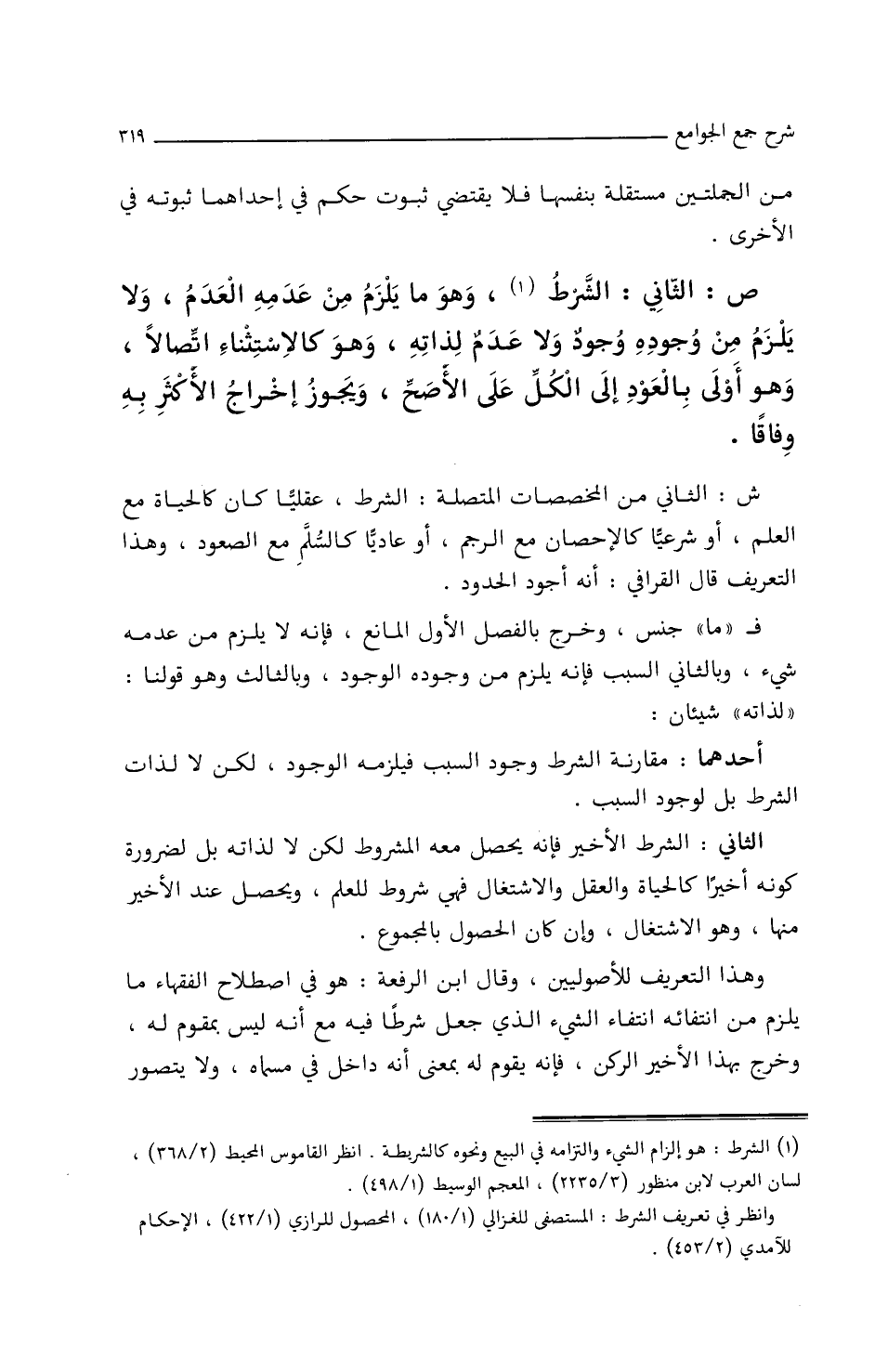 وهذا التعريف للأصوليين، وقال ابن الرفعة: هو في اصطلاح الفقهاء ما يلزم من انتفائه انتفاء الشيء الذي جعل شرطا فيه مع أنه ليس بمقوم له، وخرج بهذا الأخير الركن، فإنه يقوم له بمعنى أنه داخل في مسماه، ولا يتصور