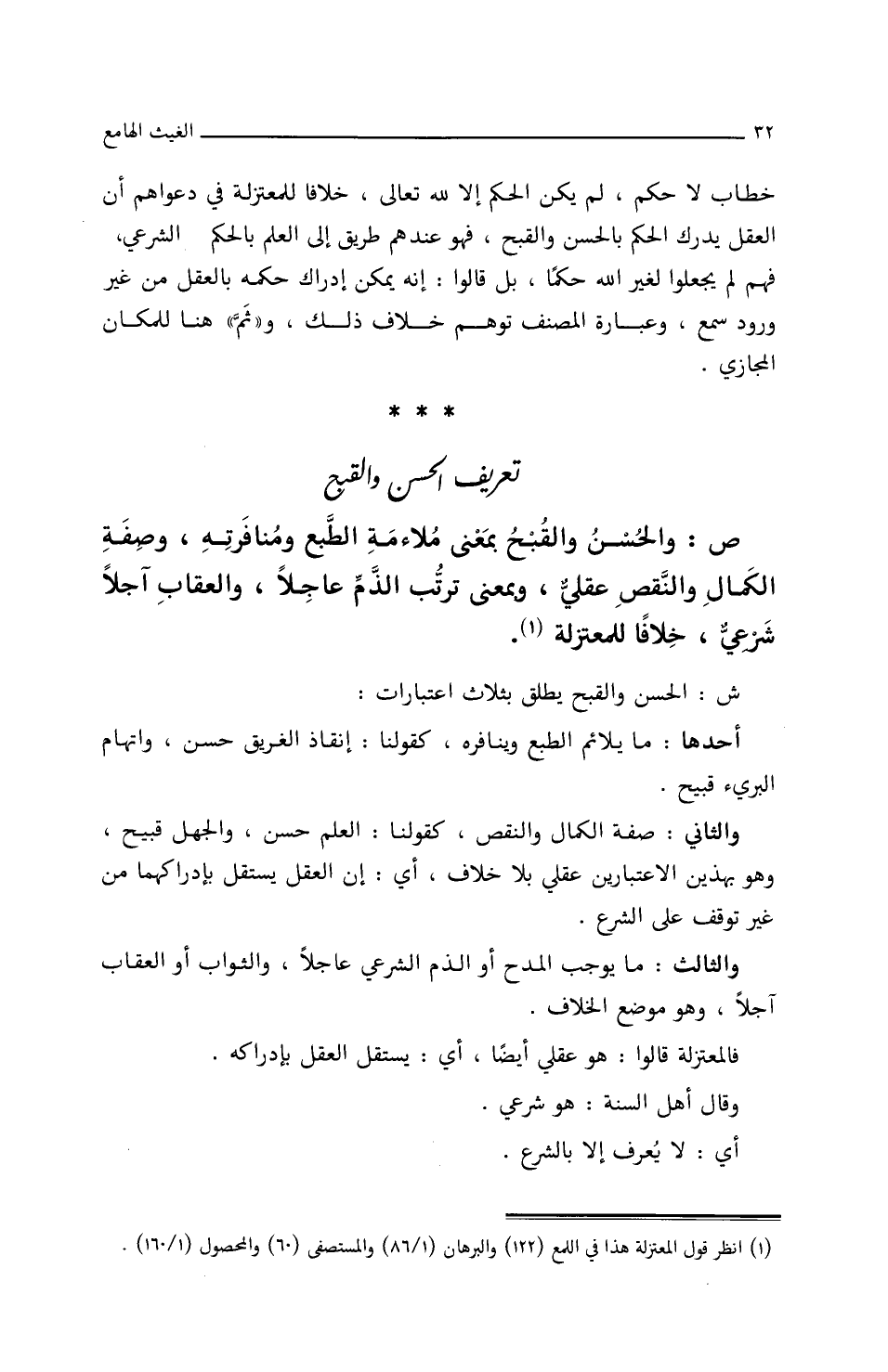 ص: والحسن والقبح بمعنى ملاءمة الطبع ومنافرته، وصفة الكمال والنقص عقلي، وبمعنى ترتب الذم عاجلاً، والعقاب آجلاً شرعي، خلافاً للمعتزلة.