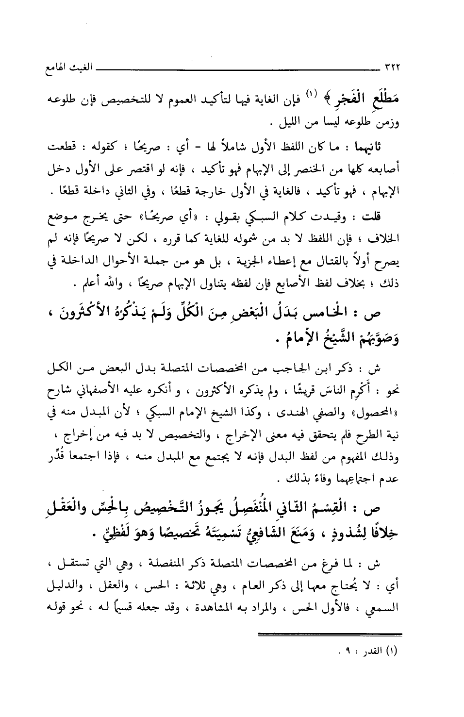 ش: ذكر ابن الحاجب من المخصصات المتصلة بدل البعض من الكل نحو: أكرم الناس قريشا، ولم يذكره الأكثرون، وأنكره عليه الأصفهاني شارح (المحصول) والصفي الهندي وكذا الشيخ الإمام السبكي، لأن المبدل منه في نية الطرح فلم يتحقق فيه معني الإخراج، والتخصيص لا بد فيه من إخراج وذلك المفهوم من لفظ البدل فإنه لا يجتمع مع المبدل منه، فإذا اجتمعا قدر عدم اجتماعهما وفاء بذلك.