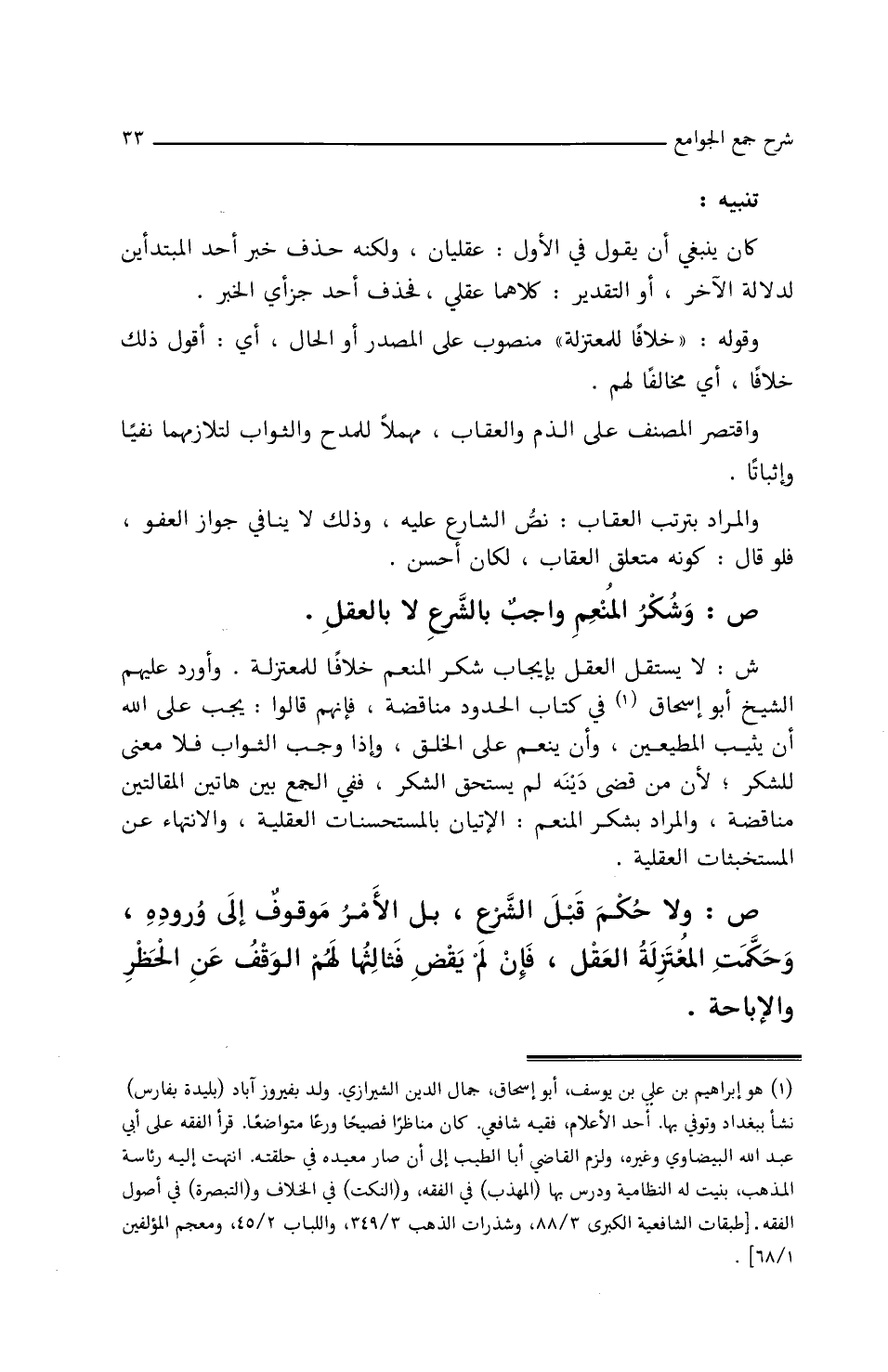 ش: لا يستقل العقل بإيجاب شكر المنعم خلافاً: للمعتزلة. وأورد عليهم الشيخ أبو إسحاق في كتاب الحدود مناقضة، فإنهم قالوا: يجب على الله أن يثبت المطيعين، وأن ينعم على الخلق، وإذا وجب الثواب فلا معنى للشكر، لأن من قضى دينه لم يستحق الشكر، ففي الجمع بين هاتين المقالتين مناقضة، والمراد بشكر المنعم الإتيان بالمستحسنات العقلية، والانتهاء عن المستخبثات العقلية.