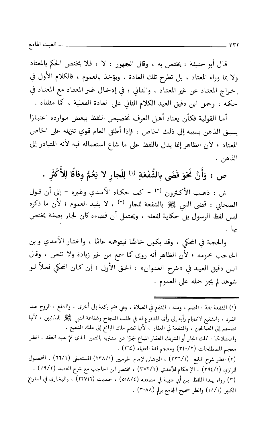 ش: ذهب الأكثرون – كما حكاه الآمدي وغيره – إلى أن قول الصحابي: قضى النبي صلى الله عليه وسلم بالشفعة للجار، لا يفيد العموم لأن ما ذكره ليس لفظ الرسول بل حكاية لفعله، ويحتمل أن قضاءه كان لجار بصفة يختص بها.
