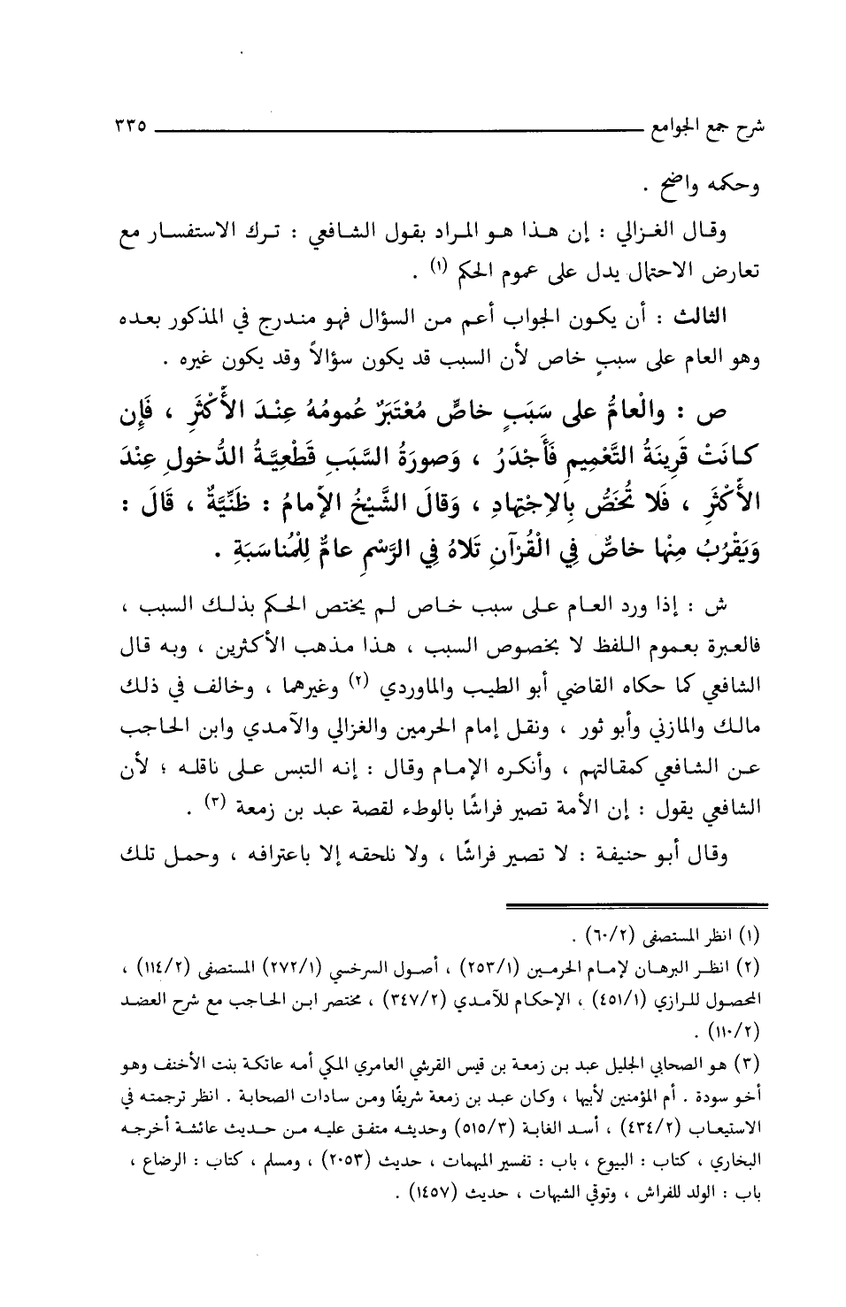 ش: إذا ورد العام على سبب خاص لم يختص الحكم بذلك السبب فالعبرة بعموم اللفظ لا بخصوص السبب، هذا مذهب/ (٧٧ب/د) الأكثرين، وبه قال الشافعي كما حكاه القاضي أبو الطيب والماوردي وغيرهما، وخالف في ذلك مالك والمزني وأبو ثور، ونقل إمام الحرمين والغزالي والآمدي وابن الحاجب عن الشافعي كمقالتهم، وأنكره الإمام وقال: أنه التبس على ناقله، لأن الشافعي يقول: إن الأمة تصير فراشا بالوطء لقصة عبد بن زمعة.