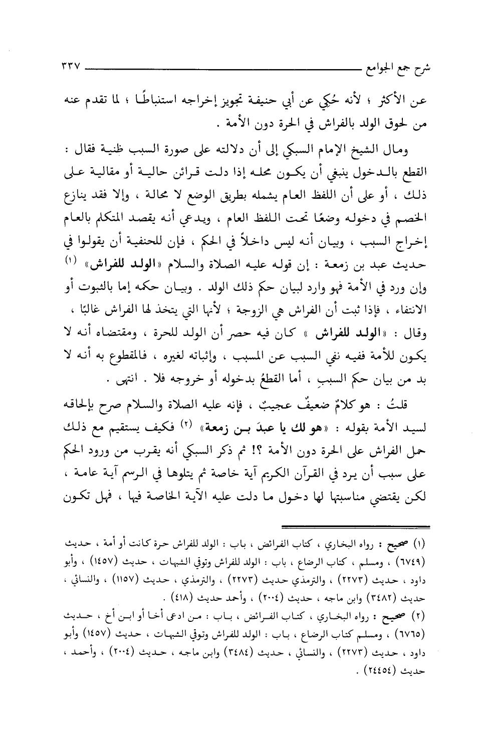 قلت: هو كلام ضعيف عجيب فإنه عليه الصلاة والسلام صرح بإلحاقه لسيد الأمة بقوله: ((هو لك يا عبد بن زمعة)) فكيف يستقيم مع ذلك حمل الفراش على الحرة دون الأمة؟ ثم ذكر السبكي أنه يقرب من ورود الحكم على سبب أن يرد في القرآن الكريم آية خاصة ثم يتلوها في الرسم آية عامة، لكن يقتضي مناسبتها لها دخول ما دلت عليه الآية الخاصة فيها، فهل تكون