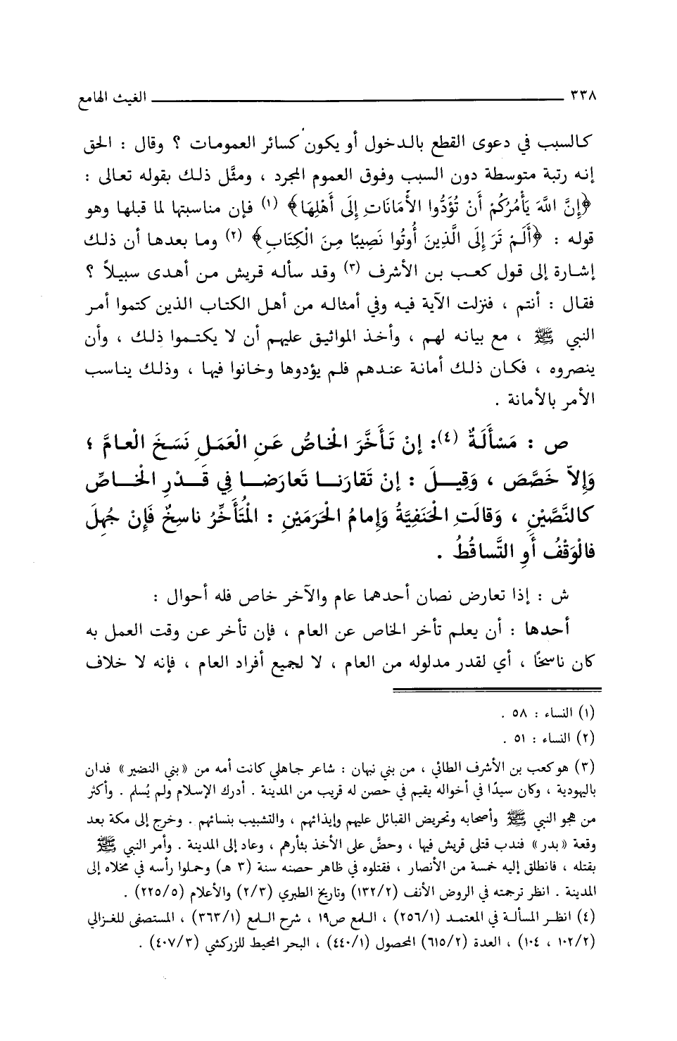 كالسبب في دعوى القطع بالدخول أو يكون كسائر العمومات؟ وقال: الحق إنه رتبة متوسطة دون السبب وفوق العموم المجرد، ومثل ذلك بقوله تعالى: {إن الله يأمركم أن تؤدوا الأمانات إلى أهلها} فإن مناسبتها لما قبلها وهي قوله/ (٩٦/أ/م) {ألم تر إلى الذين أوتوا نصيبا من الكتاب} وما بعدها أن ذلك إشارة إلى قول كعب بن الأشرف وقد سأله قريش من أهدى سبيلا؟ فقال: أنتم، فنزلت الآية فيه وفي أمثاله من أهل الكتاب الذين كتموا أمر النبي صلى الله عليه وسلم مع بيانه لهم، وأخذ المواثيق عليهم أن لا يكتموا ذلك، وأن ينصروه فكان ذلك أمانة عندهم فلم يؤدوها وخانوا فيها، وذلك يناسب الأمر بالأمانة.