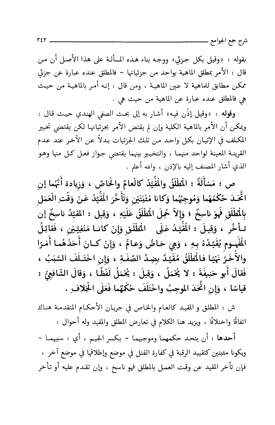ش: المطلق والمقيد كالعام والخاص في جريان الأحكام المتقدمة هناك اتفاقا واختلافا ويزيد هنا الكلام في تعارض المطلق والمقيد وله أحوال: