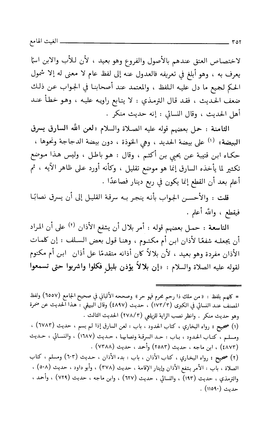 لاختصاص العتق عندهم بالأصول والفروع وهو بعيد، لأن للأب والابن اسما يعرف به، هو أبلغ في تعريفه فالعدول عنه إلى لفظ عام لا معنى له إلا شمول الحكم لجميع ما دل عليه اللفظ، والمعتمد عند أصحابنا في الجواب عن ذلك ضعف الحديث، فقد قال الترمذي: لا يتابع راويه عليه، وهو خطأ عند أهل الحديث، وقال النسائي: إنه حديث منكر.