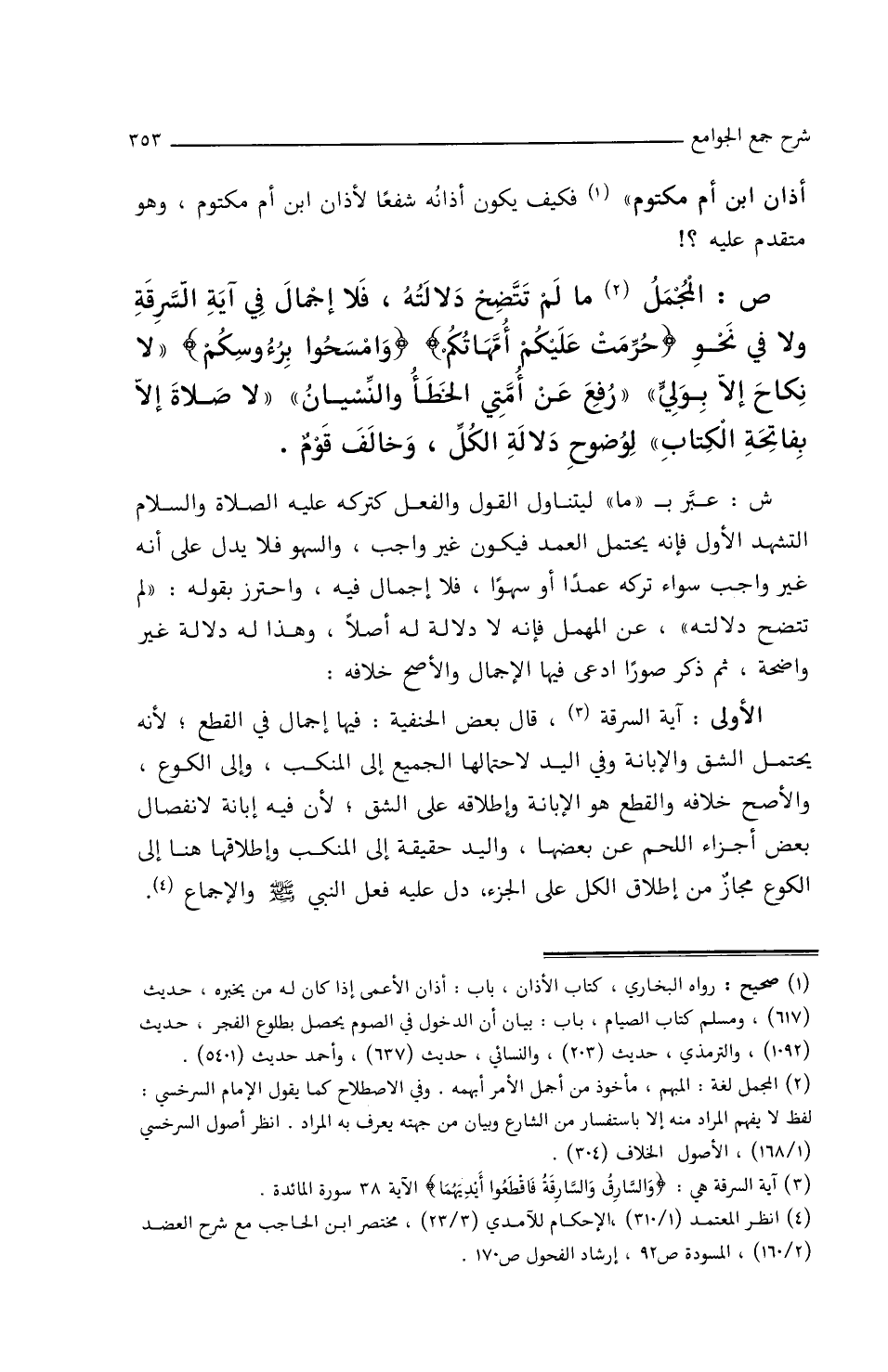 ص: المجمل ما لم تتضح دلالته فلا إجمال في آية السرقة ولا في نحو {حرمت عليكم أمهاتكم} {وامسحوا برؤوسكم} ((لا نكاح إلا بولي)) ((رفع عن أمتي الخطأ والنسيان)) ((لا صلاة إلا بفاتحة الكتاب)) لوضوح دلالة الكل وخالف قوم.