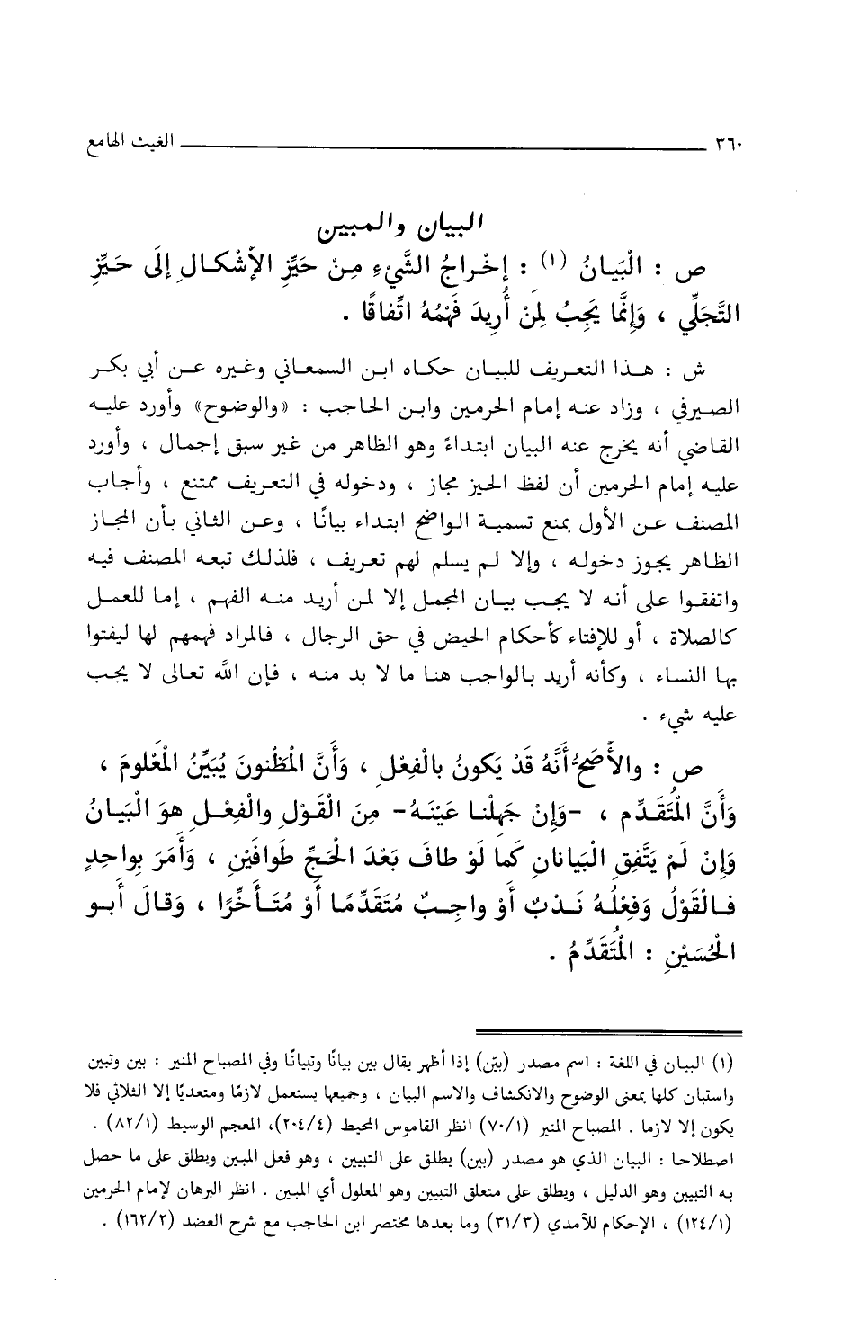 ش: هذا التعريف للبيان حكاه ابن السمعاني وغيره عن أبي بكر الصيرفي، وزاد عنه إمام الحرمين وابن الحاجب: (والوضوح) وأورد عليه القاضي أنه يخرج عنه البيان ابتداء وهو الظاهر من غير سبق إجمال، وأورد عليه إمام الحرمين، أن لفظ الحيز مجاز، ودخوله في التعريف ممتنع، وأجاب المصنف عن الأول بمنع تسمية الواضح ابتداء بيانا، وعن الثاني بأن المجاز الظاهر يجوز دخوله، وإلا لم يسلم لهم تعريف، فلذلك تبعه المصنف فيه واتفقوا على أنه/ (٨٤أ/د) لا يجب بيان المجمل إلا لمن أريد منه الفهم إما للعمل كالصلاة/ أو للإفتاء كأحكام الحيض في حق الرجال، فالمراد فهمهم/ (١٠٢ب/م) لها ليفتوا بها النساء، وكأنه أريد بالواجب هنا ما لا بد منه، فإن الله تعالى لا يجب عليه شيء.