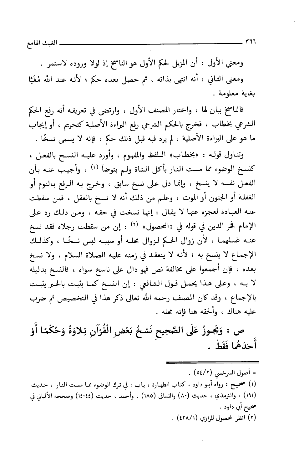 فالناسخ بيان لها، واختار المصنف الأول، وارتضى في تعريفه أنه رفع الحكم الشرعي بخطاب، فخرج بالحكم الشرعي رفع البراءة الأصلية، كتحريم، أو إيجاب ما هو على البراءة الأصلية، لم يرد فيه قبل ذلك حكم، فإنه لا يسمى نسخا.