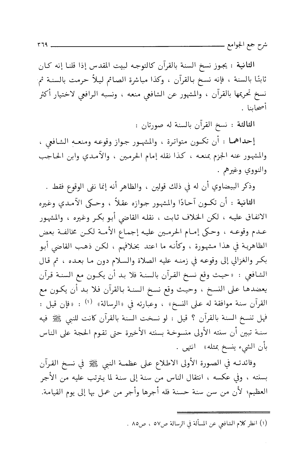 الثانية: أن تكون آحادا والمشهور جوازه عقلا، وحكى الآمدي وغيره الاتفاق عليه، لكن الخلاف ثابت، نقله القاضي أبو بكر وغيره، والمشهور عدم وقوعه، وحكى إمام الحرمين عليه إجماع الأمة لكن مخالفة بعض الظاهرية في هذا مشهورة وكأنه ما اعتد بخلافهم لكن ذهب القاضي أبو بكر والغزالي إلى وقوعه في زمنه عليه الصلاة والسلام دون ما بعده، ثم قال الشافعي: (حيث وقع نسخ القرآن بالسنة فلا بد أن يكون مع السنة قرآن يعضدها على النسخ، وحيث وقع نسخ السنة بالقرآن فلا بد أن يكون مع القرآن سنة موافقة له على النسخ) وعبارته في (الرسالة): (فإن قيل: فهل تنسخ السنة بالقرآن؟. قيل: لو نسخت السنة بالقرآن كانت للنبي صلى الله عليه وسلم فيه سنة تبين أن سنته الأولى منسوخة بسنته الأخيرة حتى تقوم الحجة على الناس بأن الشيء ينسخ بمثله) انتهى.