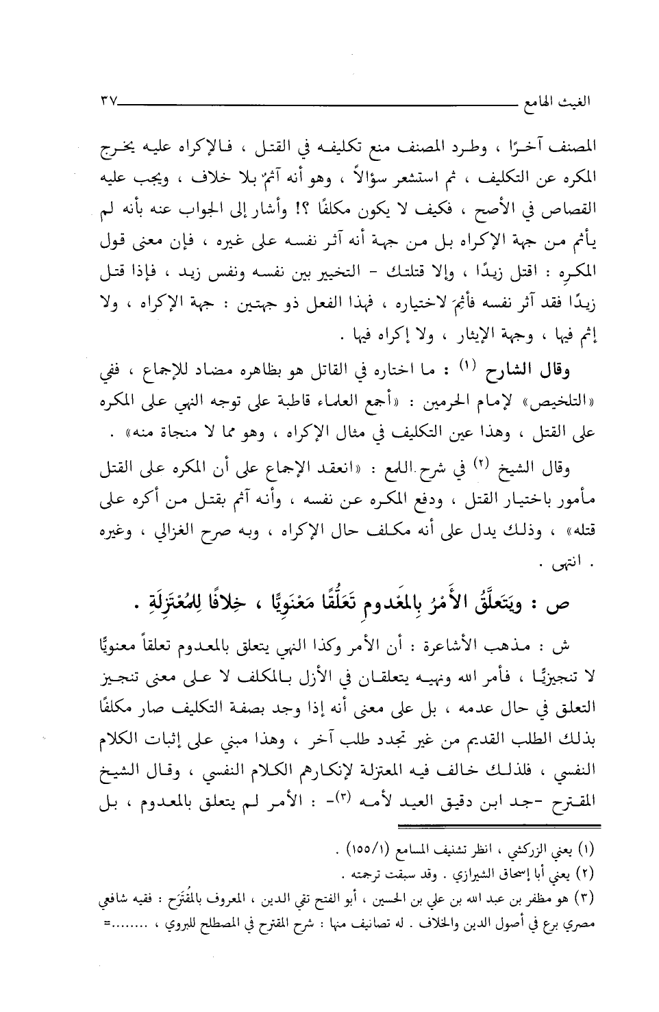 ش: مذهب الأشاعرة: أن الأمر وكذا النهي يتعلق بالمعدوم تعلقاً معنوياً لا تنجيزياً فأمر الله ونهيه يتعلقان في الأزل بالمكلف لا على معنى تنجيز التعلق في حال عدمه، بل على معنى أنه إذا وجد بصفة التكليف صار مكلفاً بذلك الطلب القديم من غير تجدد طلب آخر، وهذا مبني على إثبات الكلام النفسي، فلذلك خالف فيه المعتزلة لإنكارهم الكلام النفسي، وقال الشيخ/ (٤/أ/د) المقترح جد ابن دقيق العيد، لأمه: الأمر لم يتعلق بالمعدوم، بل