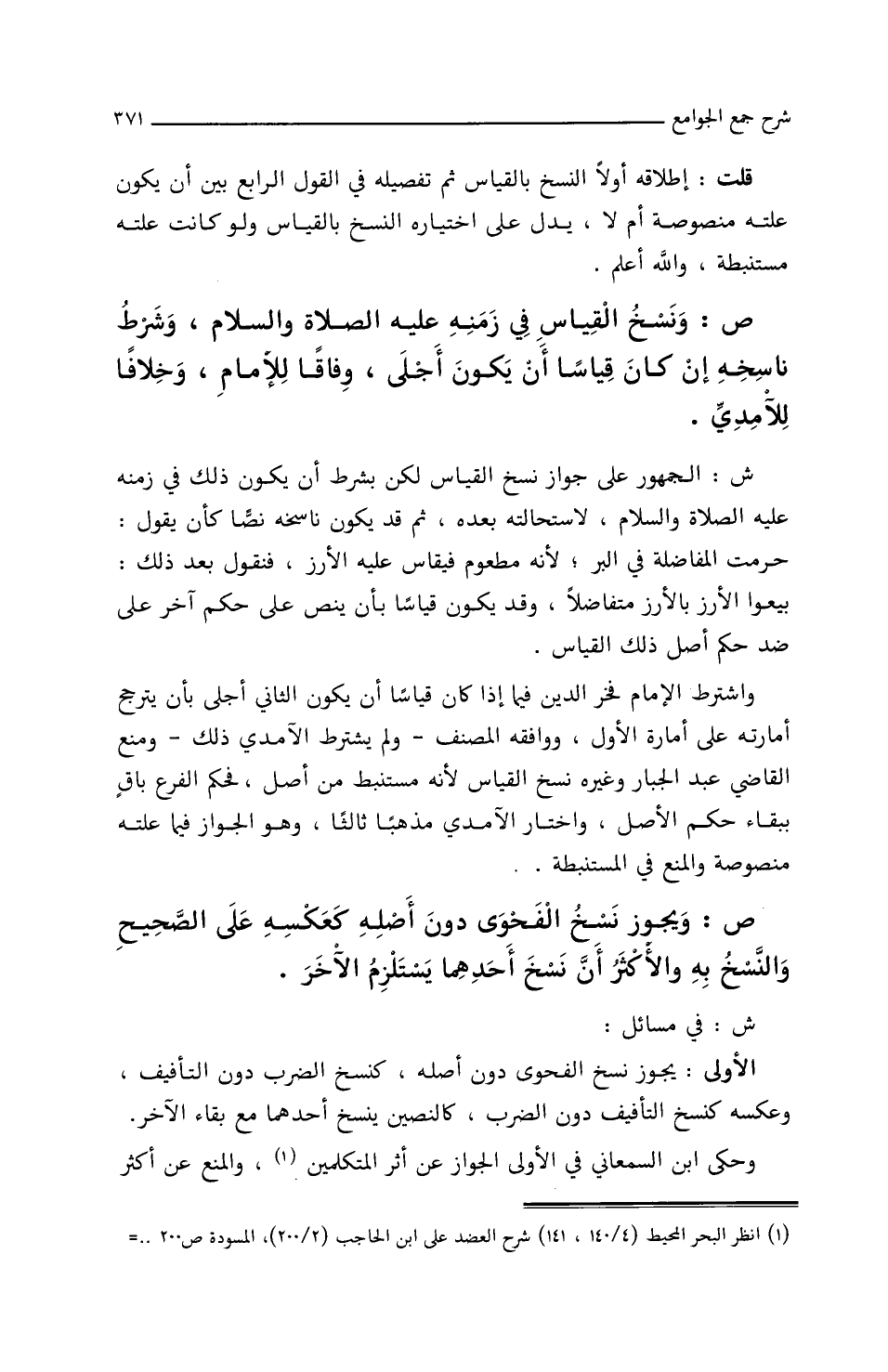 واشترط/الإمام فخر الدين فيما إذا كان قياسا أن يكون الثاني أجلى بأن يترجح أمارته على أمارة الأول، ووافقه المصنف – ولم يتشرط الآمدي ذلك – ومنع القاضي عبد الجبار وغيره نسخ القياس لأنه مستنبط من أصل، فحكم الفرع باق ببقاء حكم الأصل، واختار الآمدي مذهبا ثالثا، وهو الجواز فيما علته منصوصة والمنع في المستنبطة.