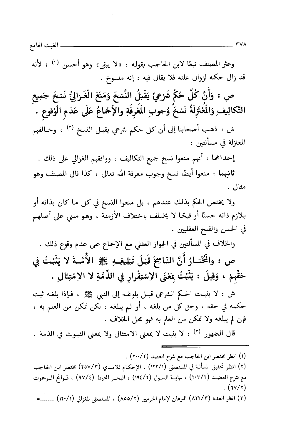 ص: وأن كل حكم شرعي/يقبل النسخ ومنع الغزالي نسخ جميع التكاليف والمعتزلة نسخ وجوب المعرفة والإجماع على عدم الوقوع.