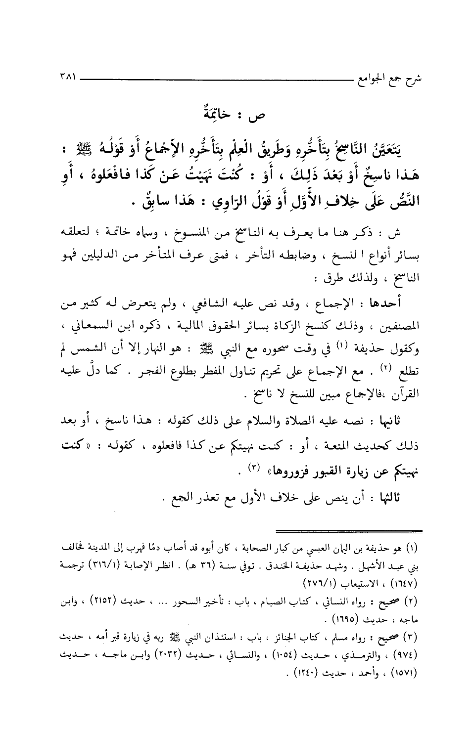 ش: ذكر هنا ما يعرف به الناسخ من المنسوخ، وسماه خاتمة، لتعلقه بسائر أنواع النسخ، وضابطه التأخر، فمتى عرف المتأخر من الدليلين فهو الناسخ، ولذلك طرق: