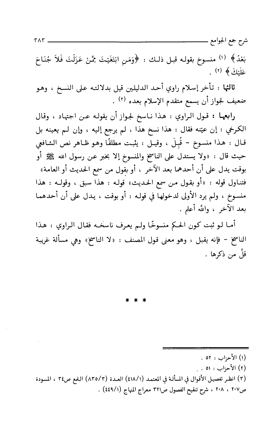 رابعها: قول الراوي: هذا ناسخ، لجواز أن يقوله عن اجتهاد وقال/ (٩٠/أ/د) الكرخي: إن عينه فقال: هذا نسخ هذا، لم يرجع إليه، وإن لم يعينه بل قال: هذا منسوخ – قبل، وقيل: يثبت مطلقا وهو ظاهر نص الشافعي حيث قال: (ولا يستدل على الناسخ والمنسوخ إلا بخبر عن رسول الله صلى الله عليه وسلم أو بوقت يدل على أن أحدهما بعد الآخر، أو بقول من سمع الحديث أو العامة) فتناول قوله: (أو بقول من سمع الحديث) قوله: هذا سابق، وقوله: هذا منسوخ، ولم يرد الأولى لدخولها في قوله: أو بوقت يدل على أن أحدهما بعد الآخر، والله أعلم.
