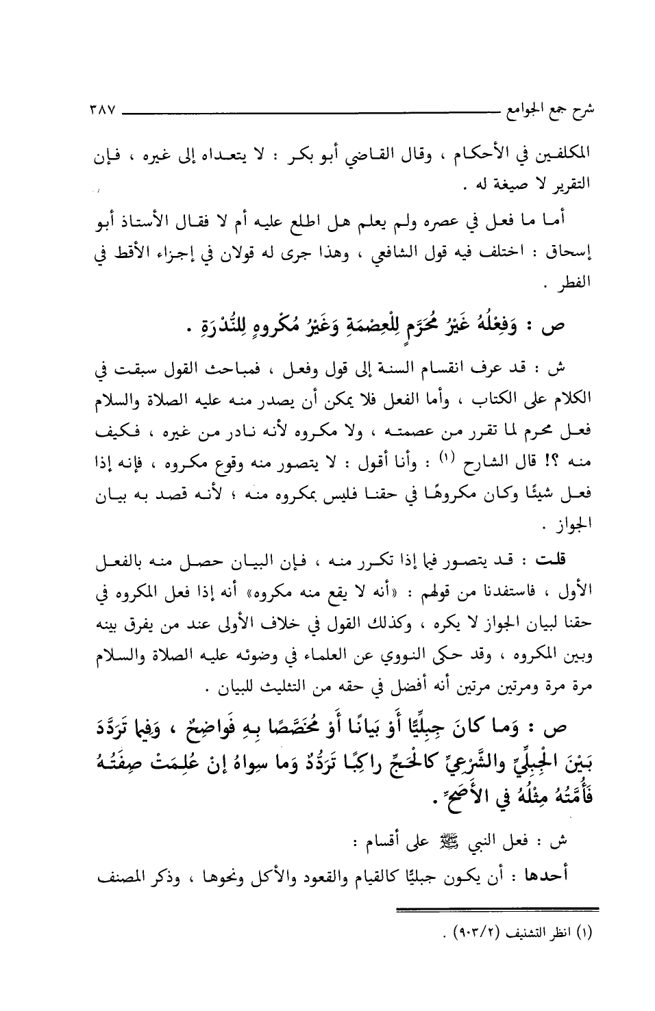 ش: قد عرف انقسام السنة إلى قول وفعل، فمباحث القول سبقت في الكلام على الكتاب، وأما الفعل فلا يمكن أن يصدر منه عليه الصلاة والسلام فعل محرم لما تقرر من عصمته، ولا مكروه لأنه نادر من غيره فكيف منه؟ قال الشارح: وأنا أقول: لا يتصور منه وقوع مكروه فإنه إذا فعل شيئا وكان مكروها في حقنا فليس بمكروه منه، لأنه قصد به بيان الجواز.