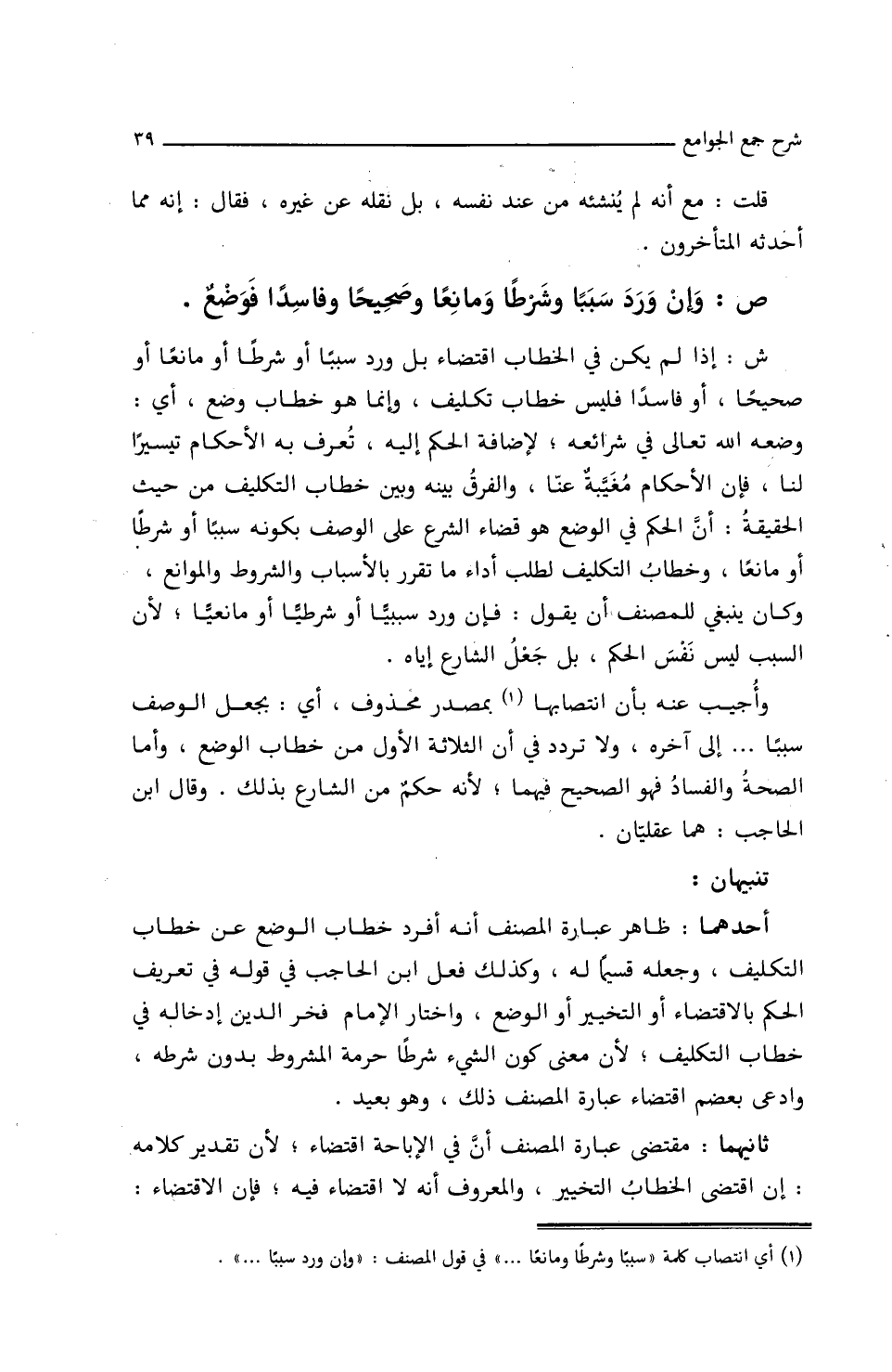 وأجيب عنه بأن انتصابها بمصدر محذوف، أي: بجعل الوصف سببا ... إلى آخره، ولا تردد في أن الثلاثة الأول من خطاب الوضع، وأما الصحة والفساد فهو الصحيح فيهما، لأنه حكم من الشارع بذلك، وقال ابن الحاجب: هما عقليان.