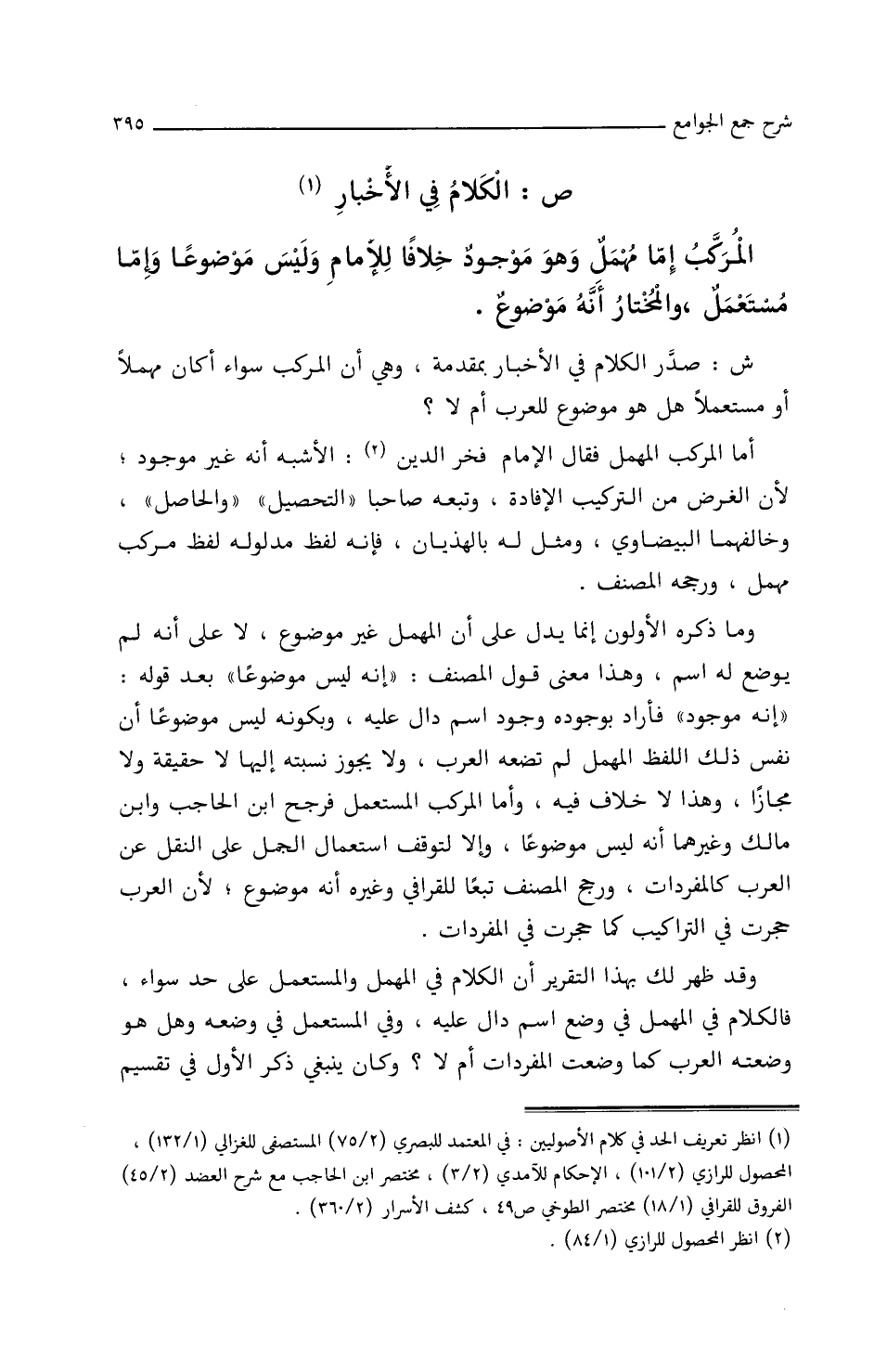 ش: صدر الكلام في الأخبار بمقدمة، وهي أن المركب سواء أكان مهملا أو مستعملا هل هو موضوع للعرب أم لا؟