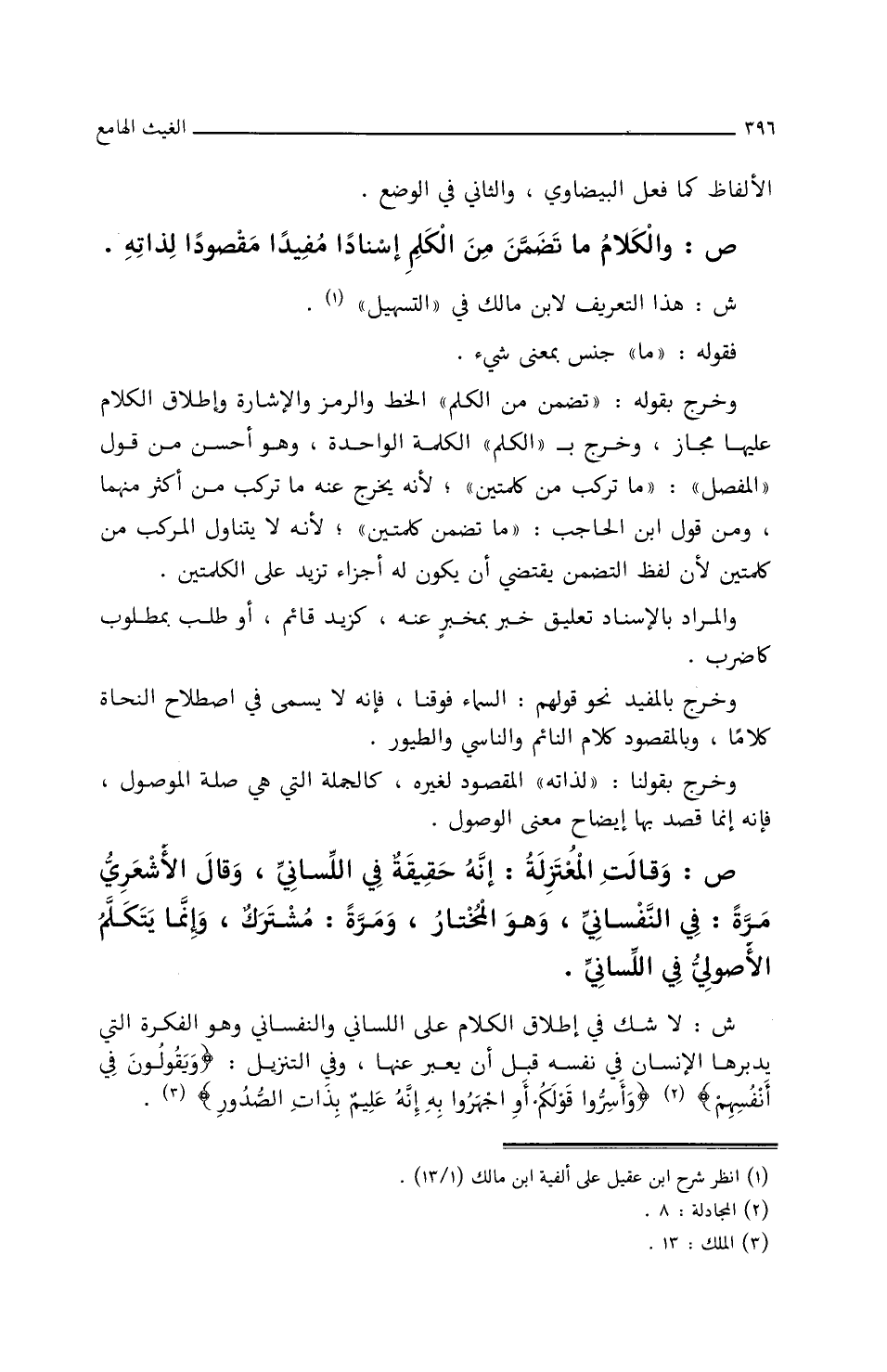 ش: لا شك في إطلاق الكلام على اللساني والنفساني وهو الفكر التي يدبرها الإنسان في نفسه قبل أن يعبر عنها، وفي التنزيل {ويقولون في أنفسهم} {وأسروا قولكم أو اجهروا به إنه عليم بذات الصدور}.