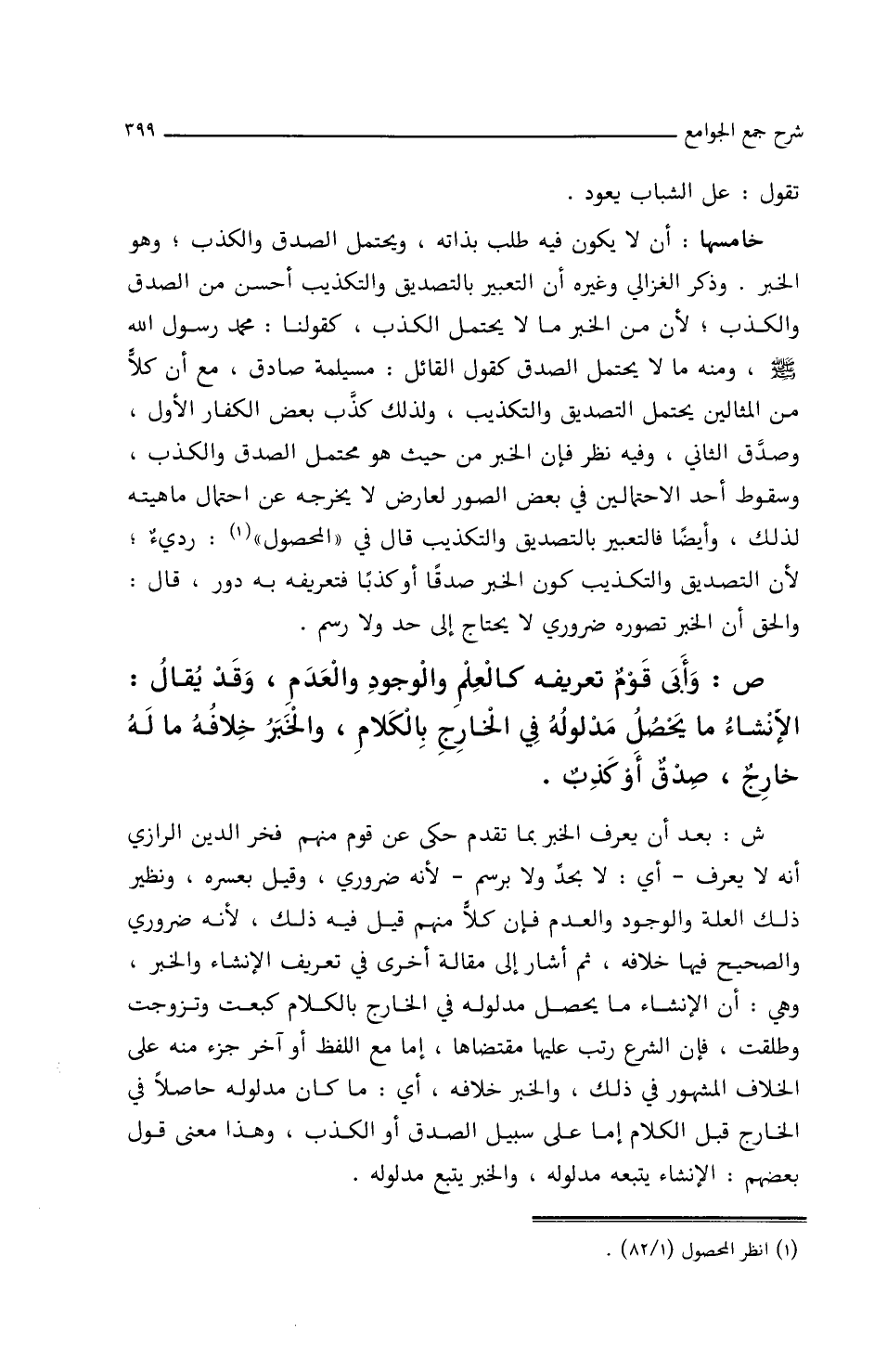 خامسها: أن لا يكون فيه طلب بذاته، ويحتمل الصدق والكذب وهو الخبر. وذكر الغزالي وغيره أن التعبير بالتصديق والتكذيب أحسن من الصدق والكذب، لأن من الخبر ما لا يحتمل الكذب، كقولنا: محمد رسول الله صلى الله عليه وسلم ومنه ما لا يحتمل الصدق كقول القائل: مسيلمة صادق، مع أن كلا من المثالين يحتمل التصديق والتكذيب، ولذلك كذب بعض الكفار الأول، وصدق الثاني وفيه نظر فإن الخبر من حيث هو محتمل الصدق والكذب وسقوط أحد الاحتمالين في بعض الصور لعارض لا يخرجه عن احتمال ماهيته لذلك وأيضا فالتعبير بالتصديق والتكذيب قال في (المحصول) رديء/ (١١٤/أ/م) لأن التصديق والتكذيب كون الخبر صدقا أو كذبا فتعريفه به دور، قال: والحق أن الخبر تصوره ضروري لا يحتاج إلى حد ولا رسم.