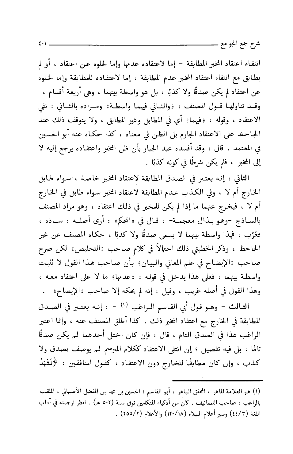 الثالث: وهو قول أبي القاسم الراغب، إنه يعتبر في الصدق المطابقة في الخارج مع اعتقاد المخبر ذلك،/ (١١٥/أ/م) كذا أطلق المصنف عنه وإنما اعتبر الراغب هذا في الصدق التام، قال: فإن كان اختل أحدهما لم يكن صدقا تاما، بل فيه تفصيل إن انتفى الاعتقاد ككلام المبرسم لم يوصف بصدق ولا كذب وإن كان مطابقا للخارج دون الاعتقاد كقول المنافقين {نشهد