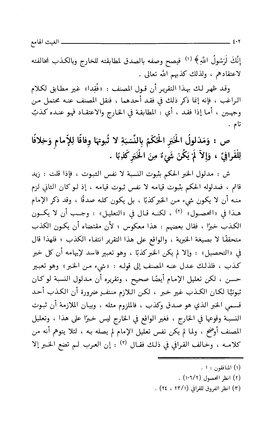ص: ومدلول الخبر الحكم بالنسبة لا ثبوتها وفاقا للإمام وخلافا للقرافي وإلا لم يكن شيء من الخبر كذبا.