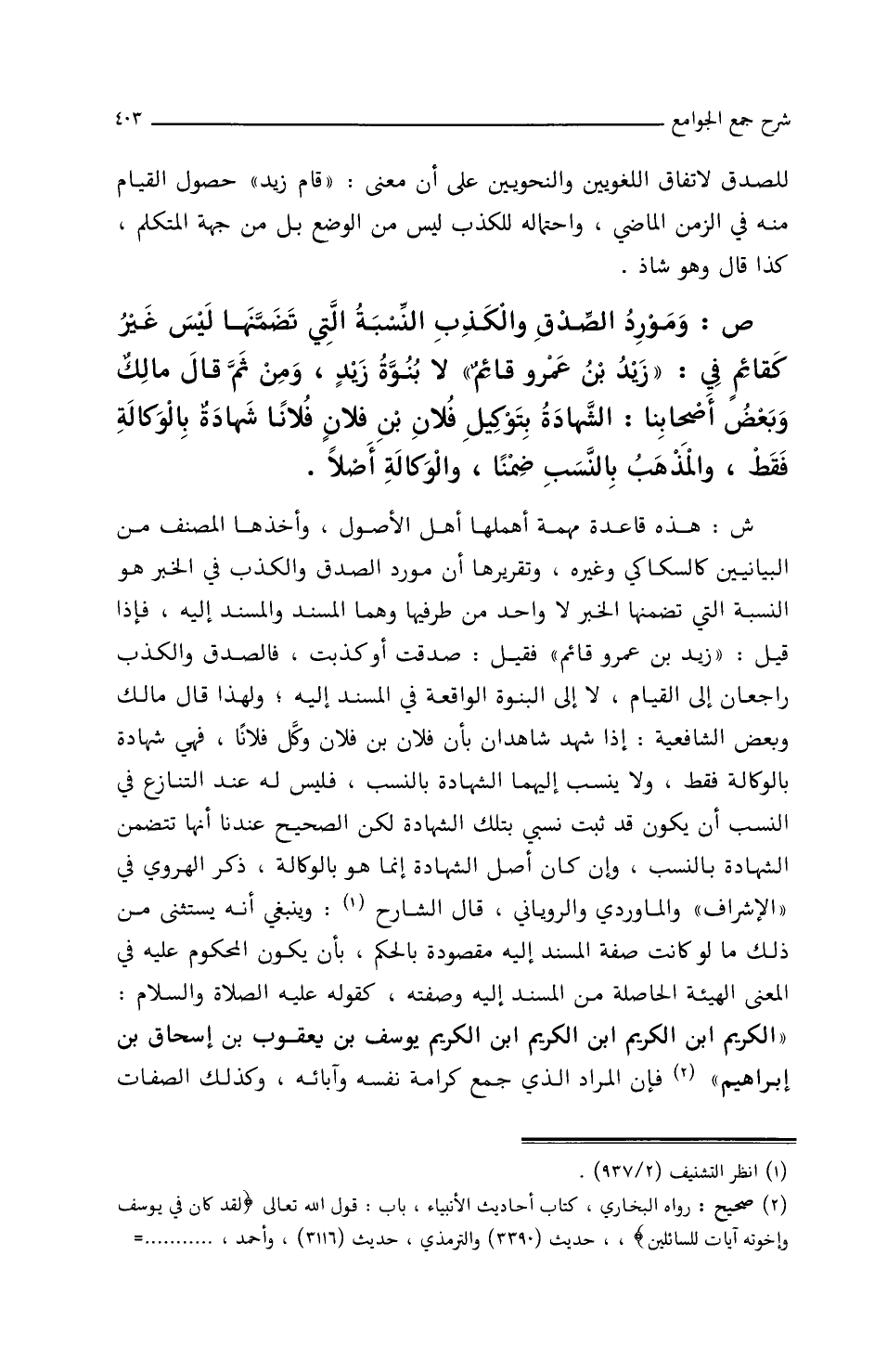 ص: ومورد الصدق والكذب النسبة التي تضمنها ليس غير كقائم في: (زيد بن عمرو قائم) لا بنوة زيد، ومن ثم قال مالك وبعض أصحابنا: الشهادة بتوكيل فلان بن فلان فلانا شهادة بالوكالة فقط، والمذهب بالنسب ضمنا والوكالة أصلا.