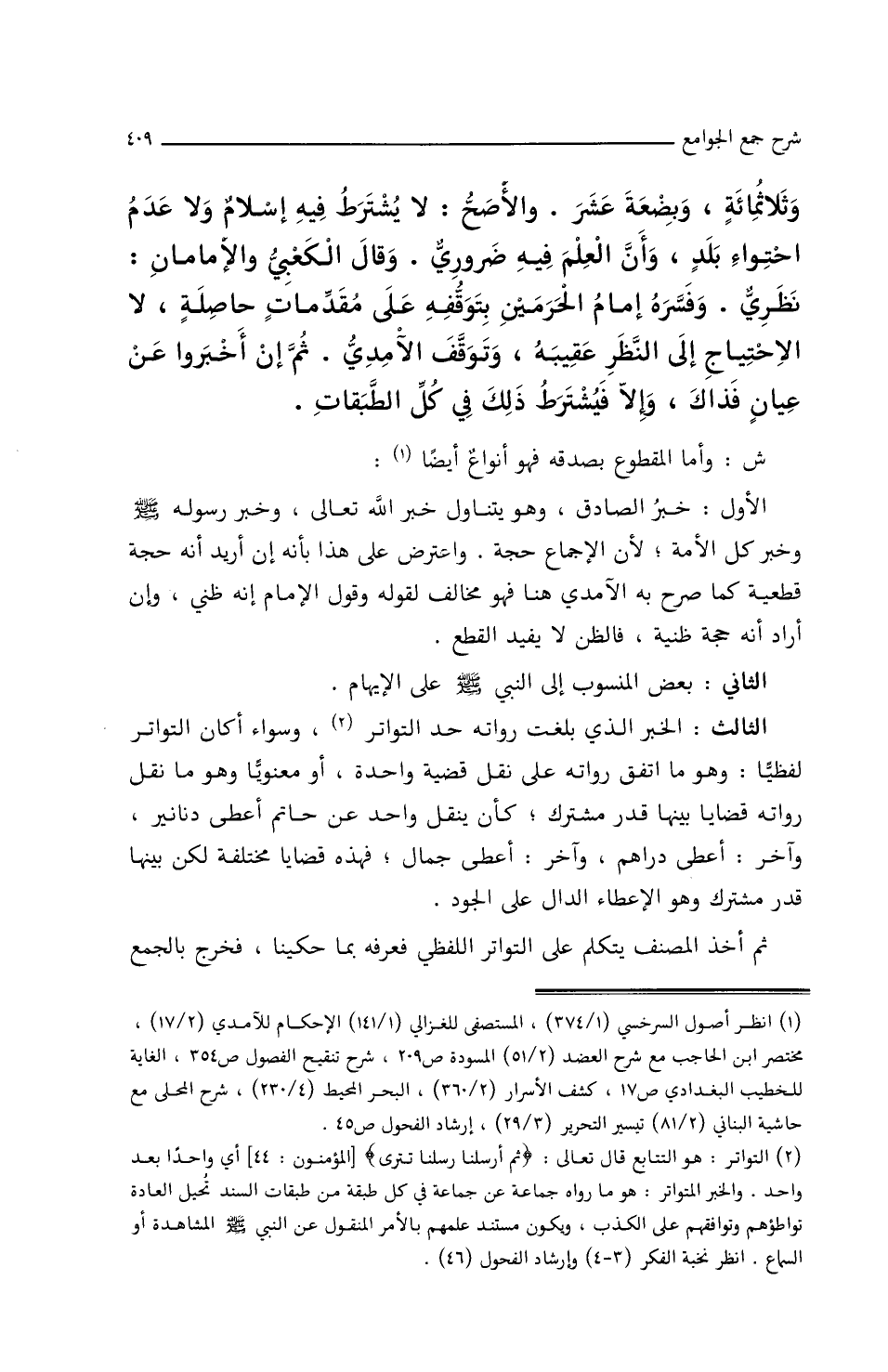 وثلاثمائة، وبضعة عشر. والأصح: لا يشترط فيه إسلام ولا عدم احتواء بلد، وأن العلم فيه ضروري وقال الكعبي والإمامان: نظري. وفسره إمام الحرمين بتوقفه على مقدمات حاصلة. لا الاحتياج إلى النظر عقيبه، وتوقف الآمدي، ثم إن أخبروا عن عيان فذاك وإلا فيشترط ذلك في كل الطبقات.